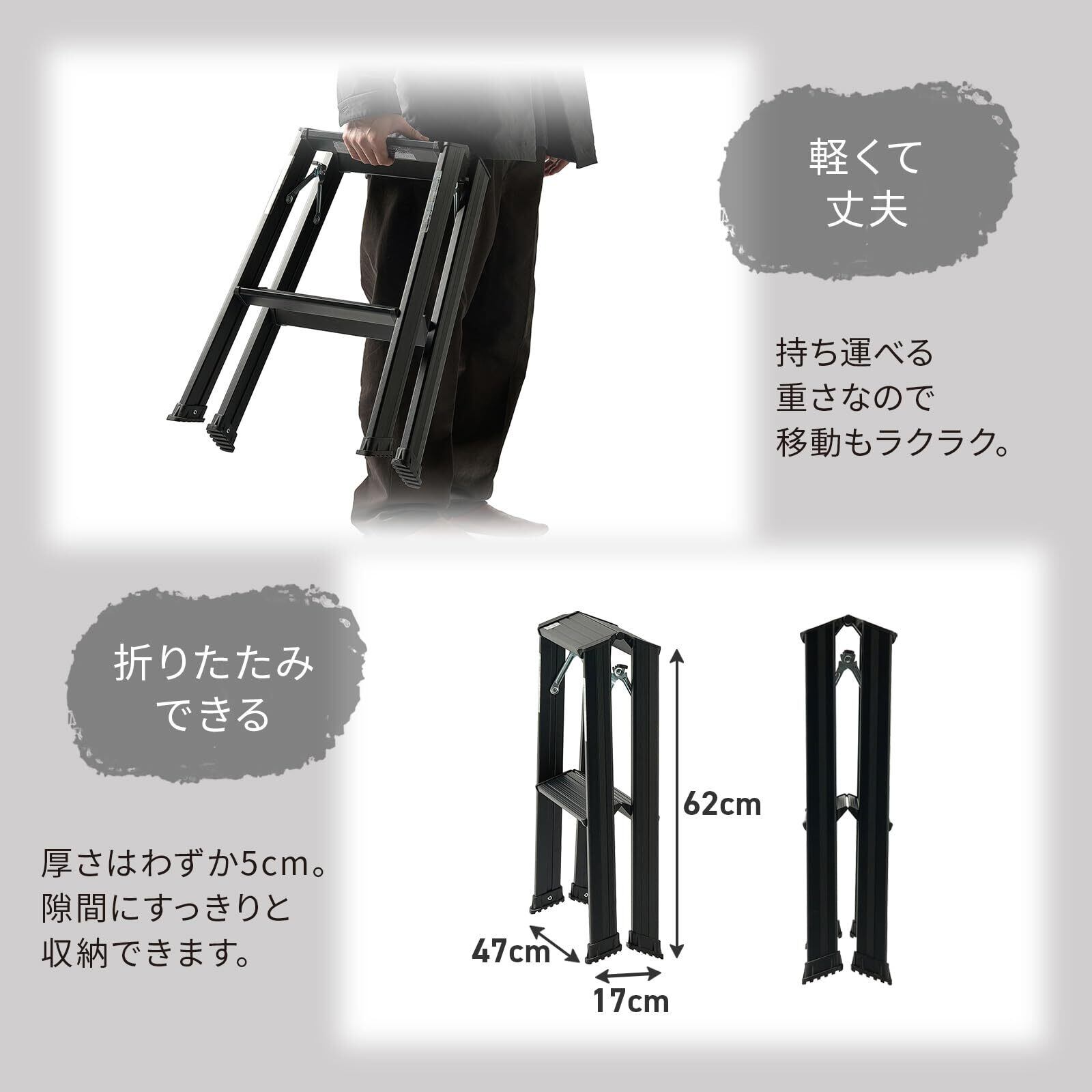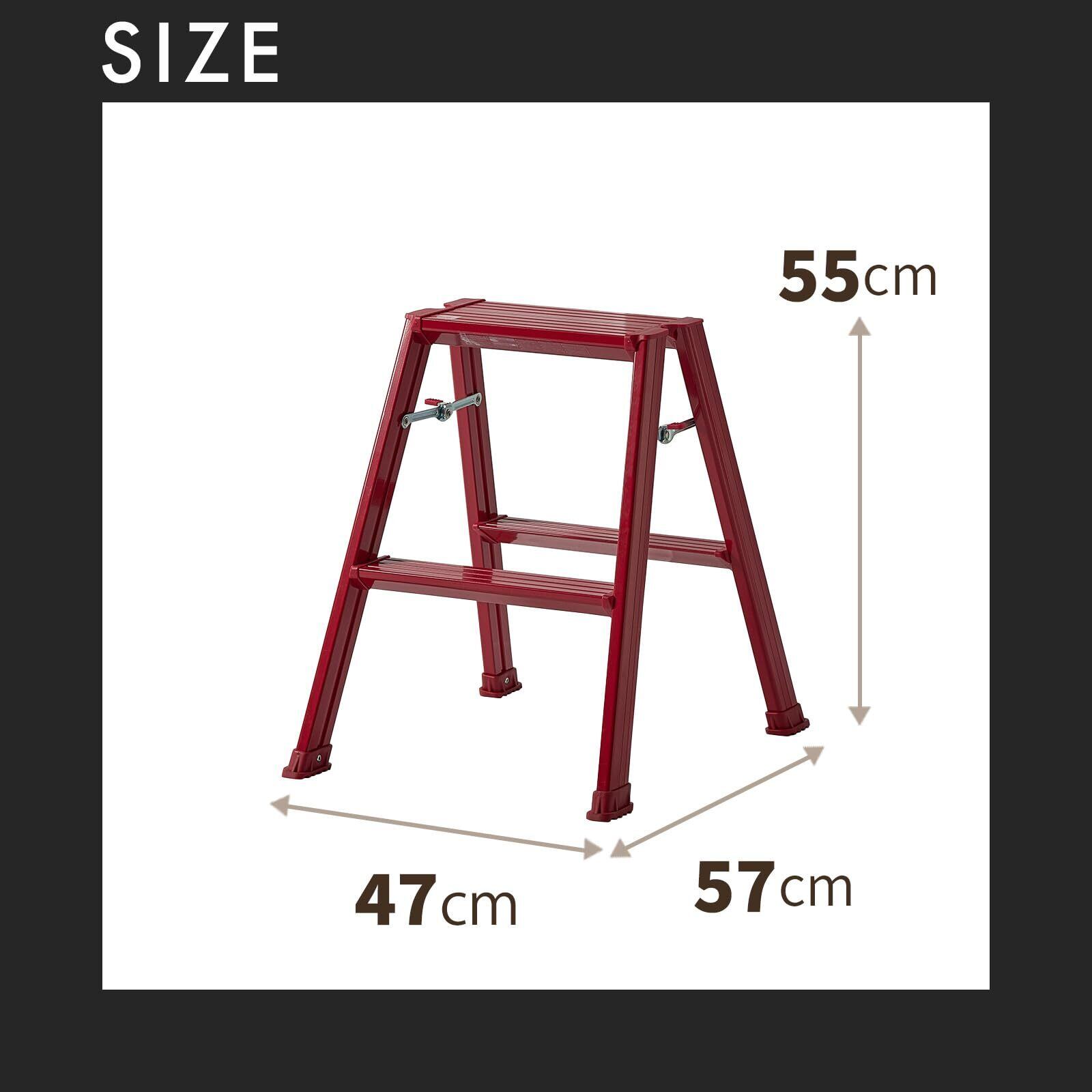 サイズ:幅47cm × 奥行57cm × 高さ55cm、特徴:アルミ製、軽量、踏み台2段、折りたたみ式