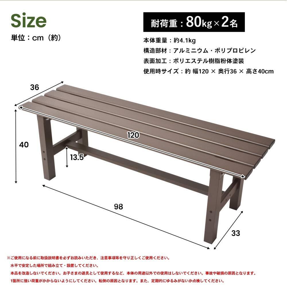 【仕様】<br>●使用時寸法(約):幅1200×奥行360×高さ400(mm)<br>●座面の高さ(約):400mm<br>●耐荷重:80kg×2名<br>※耐荷重は測定値であり、値ではありません。<br>●構造部材:アルミニウム・ポリプロピレン<br>●表面加工:ポリエステル樹脂粉体塗装