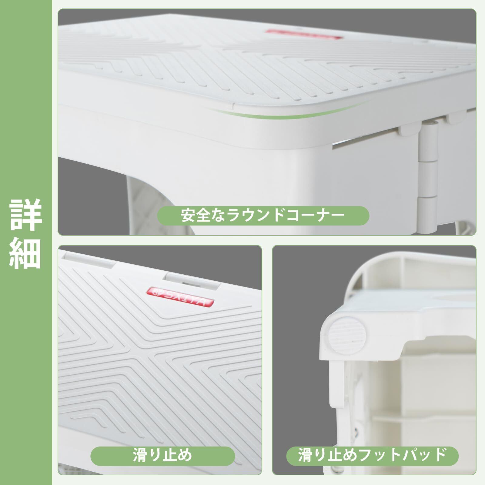 耐荷重160kgを備えたこの踏み台は、頑丈な構造から高い安定性を提供します。脚部には滑り止め加工が施されており、高所での作業も安心して行える設計です。洗車、トイレの手洗い、キッチンでの高い棚の出し入れなど、さまざまなシーンでご利用いただけます。