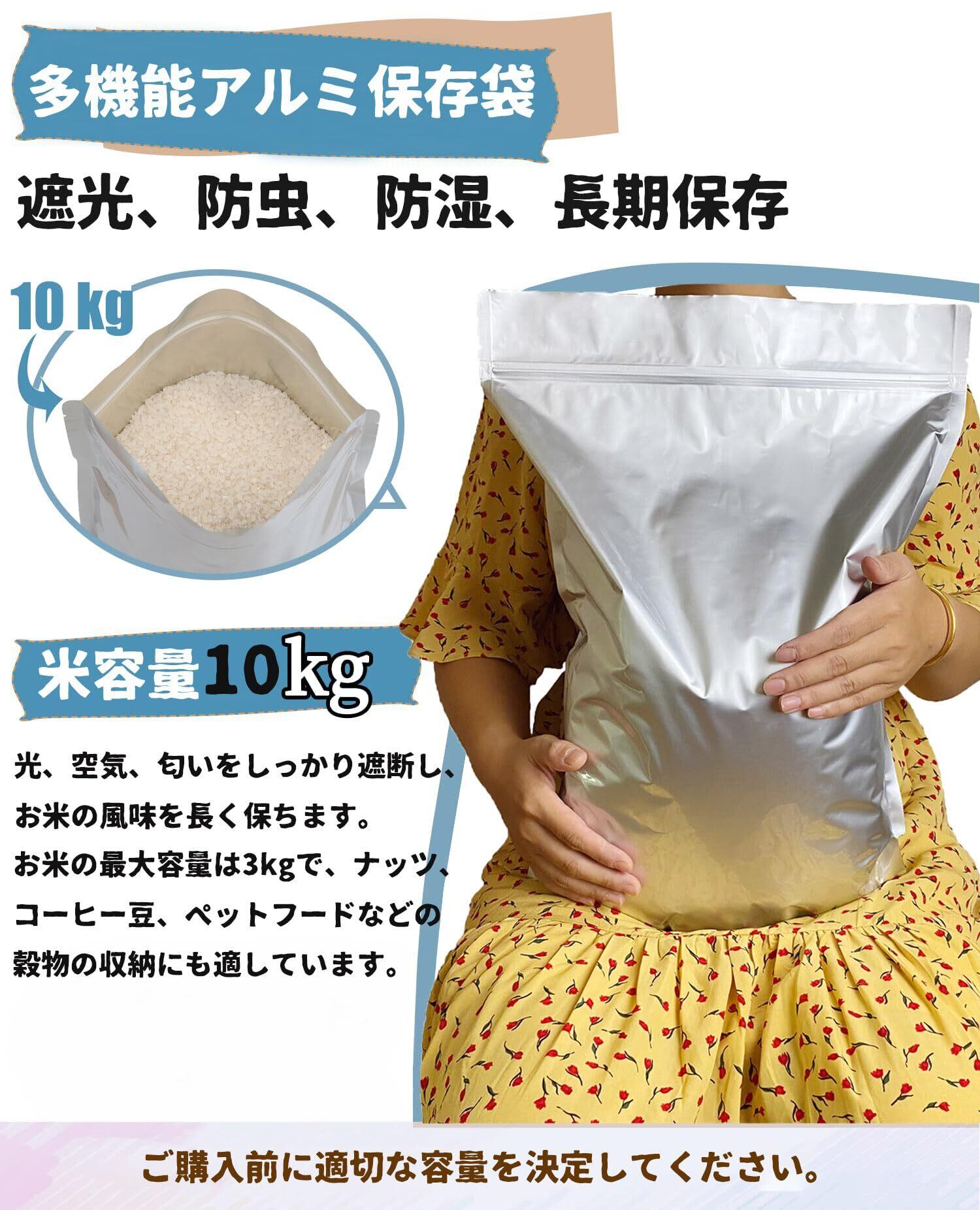 「この米袋で、大切なお米をしっかりと保存してみませんか!」/特徴:お米の鮮度を保つためのアルミ製保存袋で、10kgのお米をしっかりと収納できます。ジッパー付きで開閉も簡単、冷蔵庫での保存にも最適な設計です。特大サイズ(35x50cm)で、大量のお米もスムーズに収納!