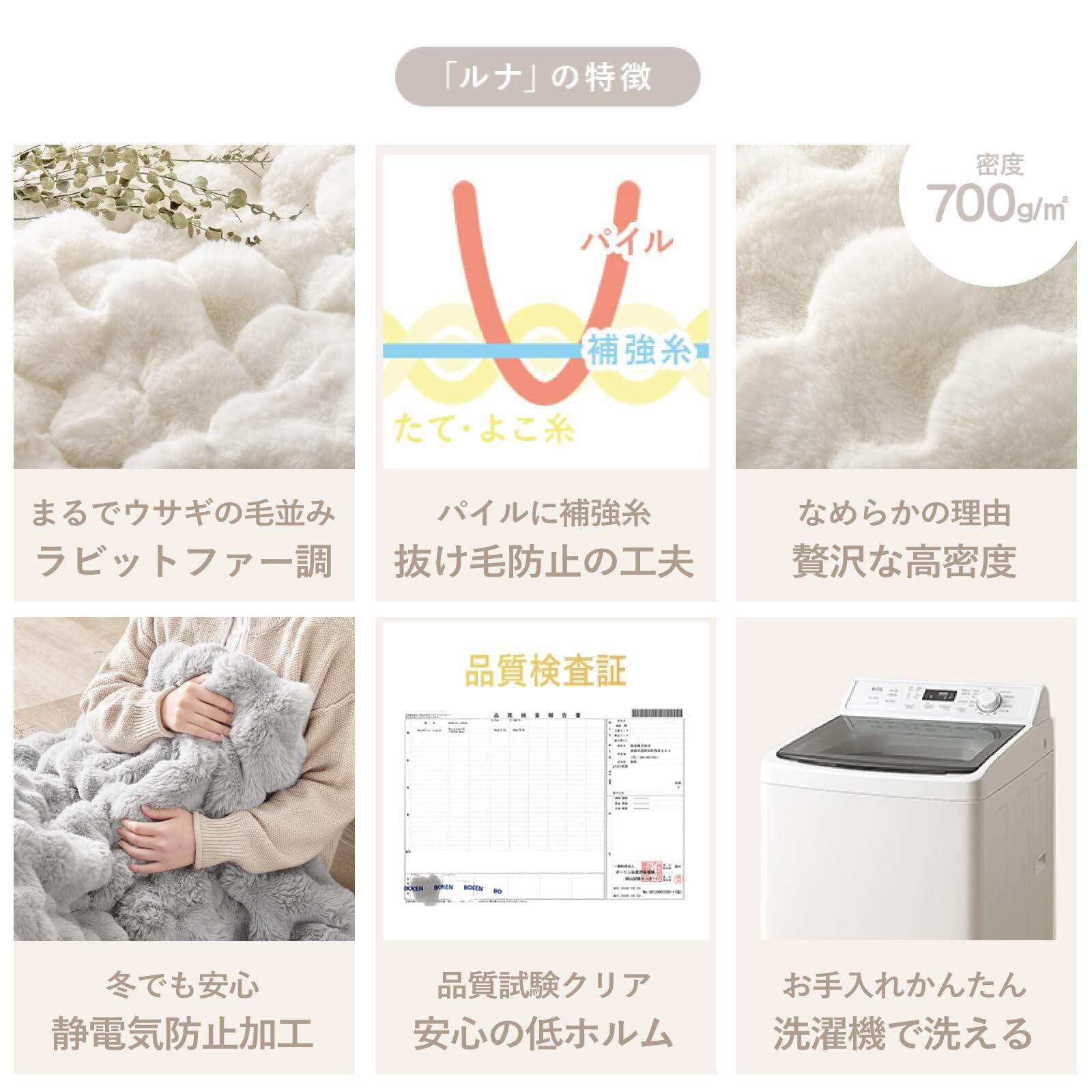 【極上の触り心地・暖かい】 表も裏も思わず頬ずりしたくなるような、とろけるようななめらかさです。表面は毛足が約30mmで高密度。まるで本物のウサギをモフモフしているような幸せな気分になれる触り心地です。裏面は起毛し暖かく柔らかで肌触りがいいフランネル素材を使用しています。