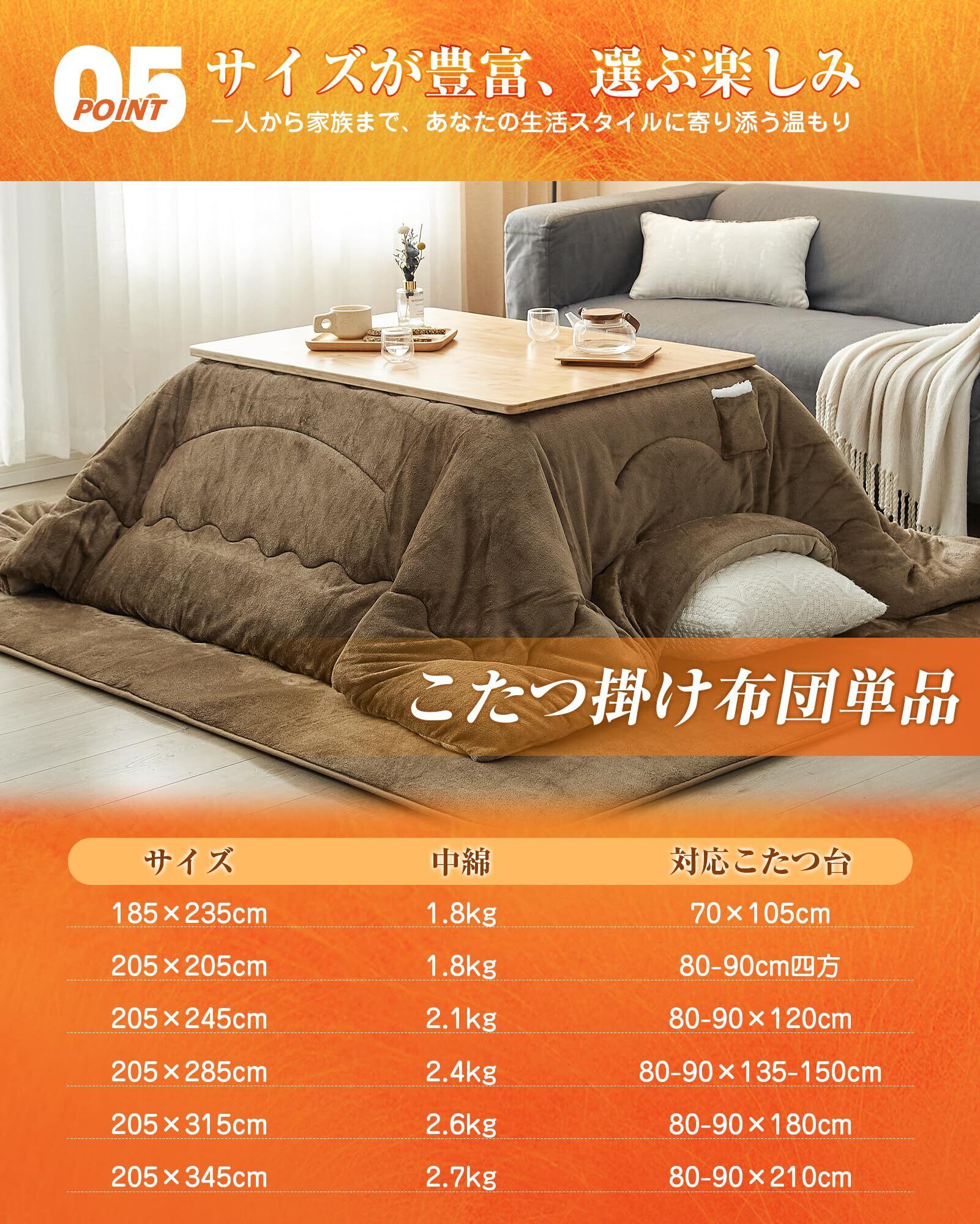 【便利なポケット付き】おしゃれなシープボアとフランネルを使用、見た目かわいい。リモコンや携帯が簡単に入る。【体にフィットする縫製】体に沿うフィットキルトを採用、綿のかたよりを防ぐ、こたつの中の熱を逃しにくい。※205*285cm/205*315cm/205*345cmのこたつ布団は普通のキルト仕様。【撥水効果で汚れにくい】飲み物をこぼしてしまっても、サッと拭き取れていつでも清潔。