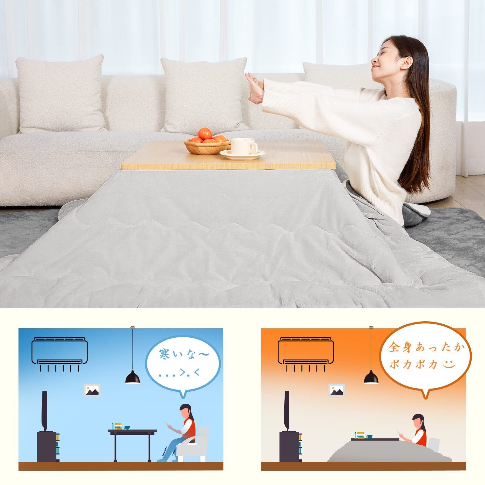 吸湿発熱機能により、体から放出された水分を熱に変換し、こたつ内の温かさを持続させます。さらに、中に充填された中綿は断熱効果を高め、快適な暖かさを保ちます。静電気防止機能も搭載されており、冬場の不快な静電気を防ぎます。