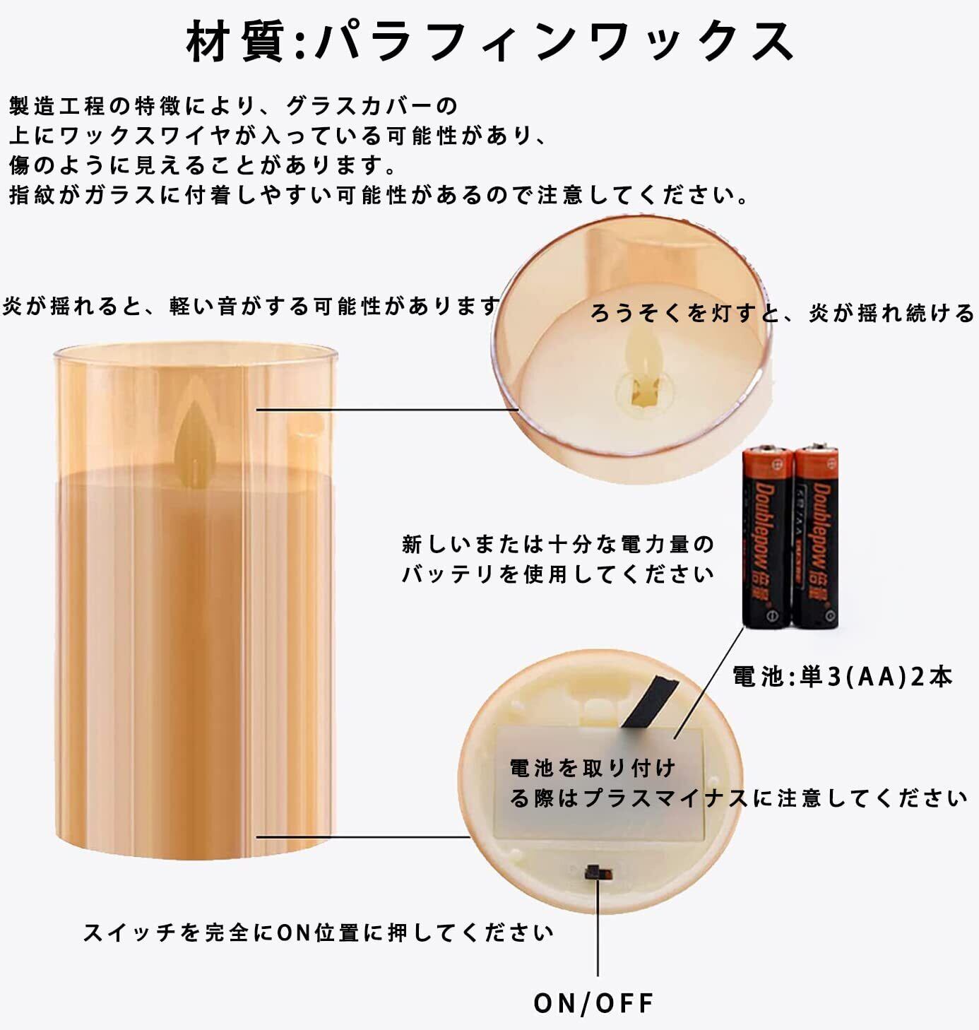 【使用便利】:1) 2本のAA電池(含まれていません)を各キャンドルのバッテリーハウスに入れてから、「オン」スイッチに移動します。2) IRリモコンを使って、タイマー機能などのキャンドルをコントロールできます。タイマーモード:2時間/4時間/6時間/8時間の自動消灯タイマー設定可, 1つのリモコンで距離が6M未満であれば、すべてのキャンドルをコントロールできます。リモコンにて点灯後タイマー設定をします。タイマー自動消灯した後、24時間後の同時刻に自動点灯され、前日と同じように同時刻に消灯いたします。【使用前にプラスチック片を抜いてください。リモコンの使用範囲は6メートルぐらいで、遮蔽物があればリモコンの使用効果に影響する可能性があります。また、リモコンは個別に点灯する1つのキャンドルを制御することができます。】