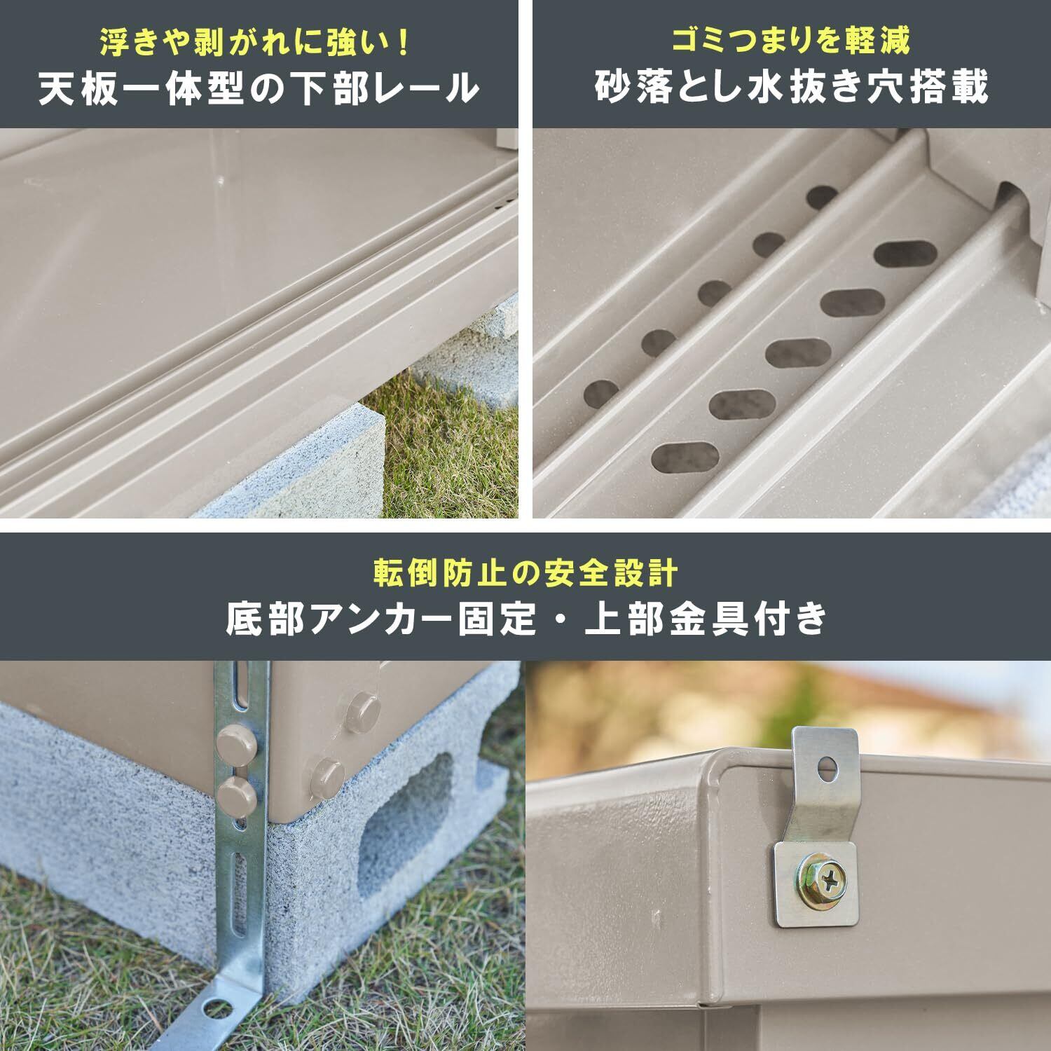 【扉の開閉がスムーズ】扉のレールは吊り戸式を採用し扉の開閉が軽く、音も静かでスムーズ。扉開閉部に付いている緩衝材は衝撃吸収の役割を果たし、扉を閉めるときに起こる金属音を軽減。下部レールは棚板一体型設計になっており、浮きや剥がれに強い。また、「砂落とし水抜き穴」がレールに施され、ゴミつまりを軽減。