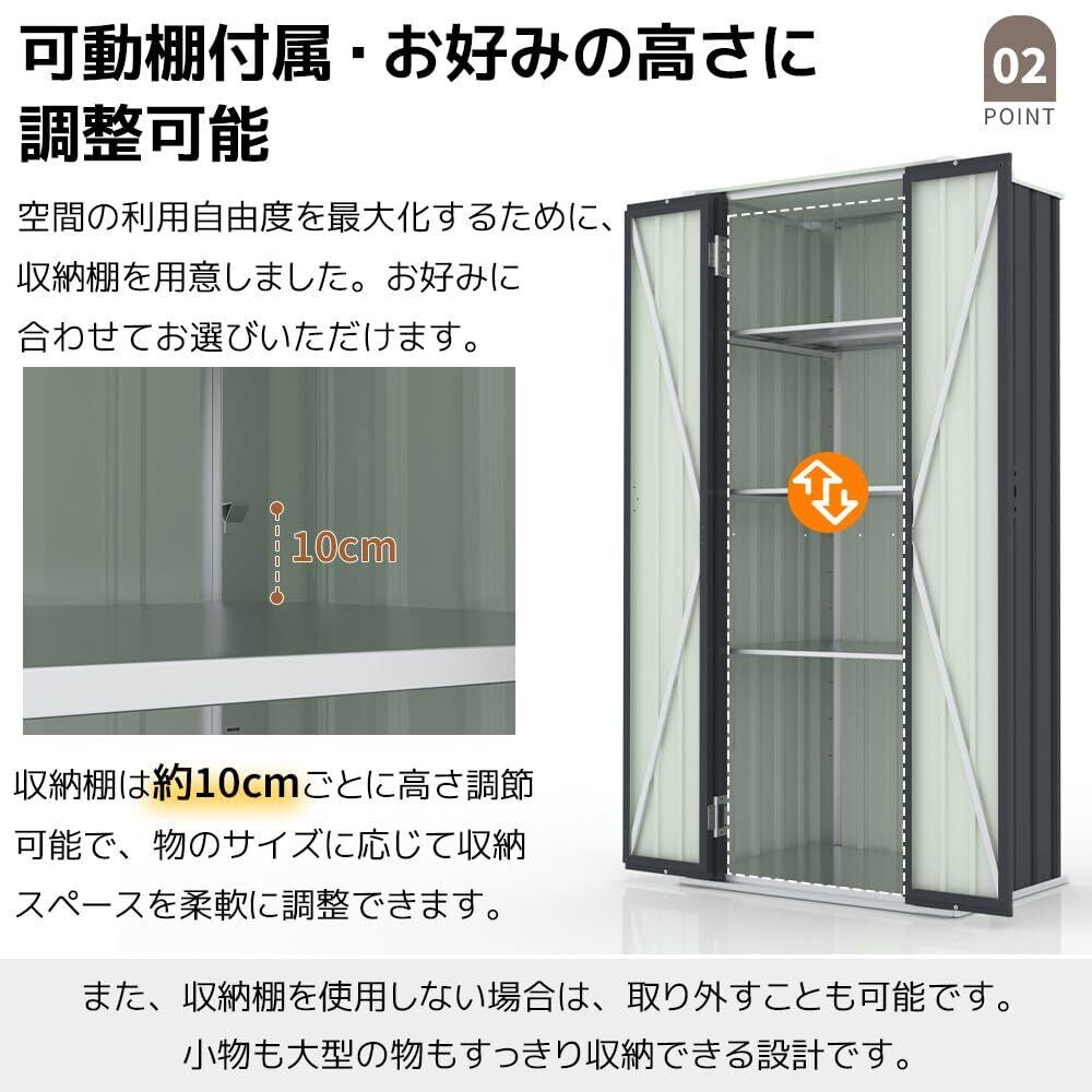 サイズは幅83.2cm、奥行58.5cm、高さ176cmのスリムな設計で、庭やガレージにぴったりフィット。ガーデニング道具やキャンプ用品、工具類など様々なアイテムをしっかり収納できます。