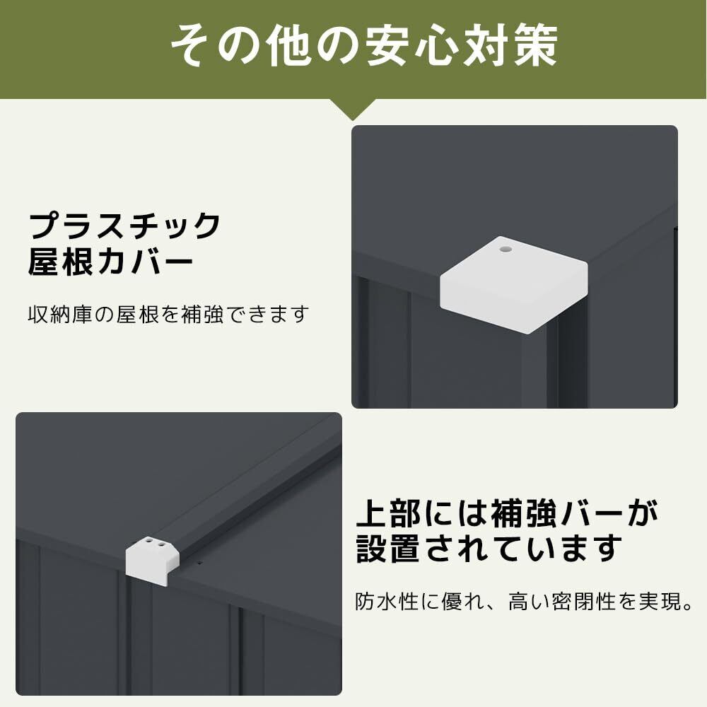 【大容量でしっかり収納】約650Lの大容量収納力抜群園芸道具・工具 ・ 掃除道具・・・庭や室内で場所を取る物品をしっかり片付けることができます。スペースが無駄なく使え、庭にはすっきり!また、収納棚を使用しない場合は、取り外すことも可能です。小物も大型の物もすっきり収納できる設計です。