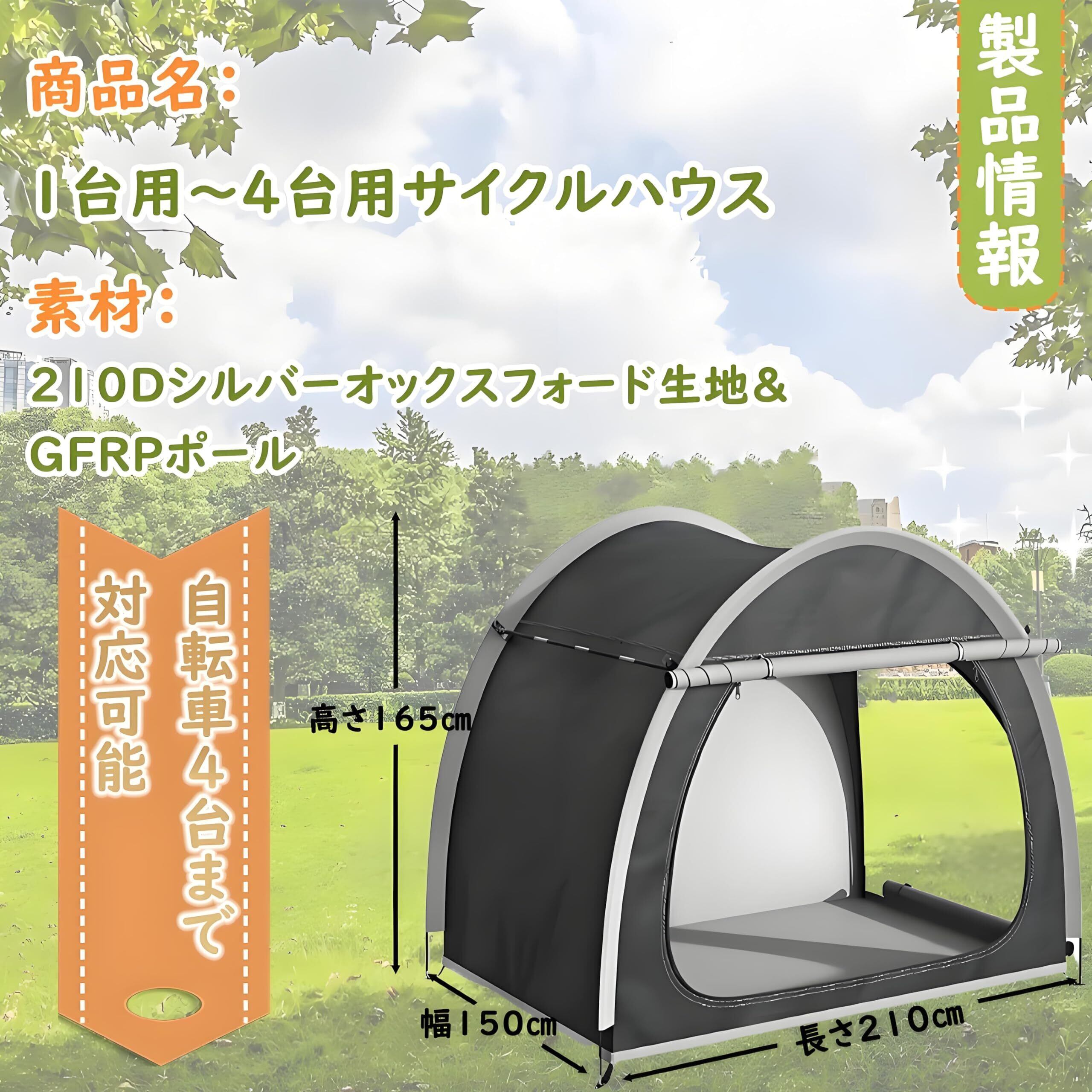 このサイクルハウスは、4台までの自転車を余裕で収納できるサイズを誇ります。屋外での使用に最適で、自転車だけでなく、バイクやアウトドア用具の保管にも活躍します。
