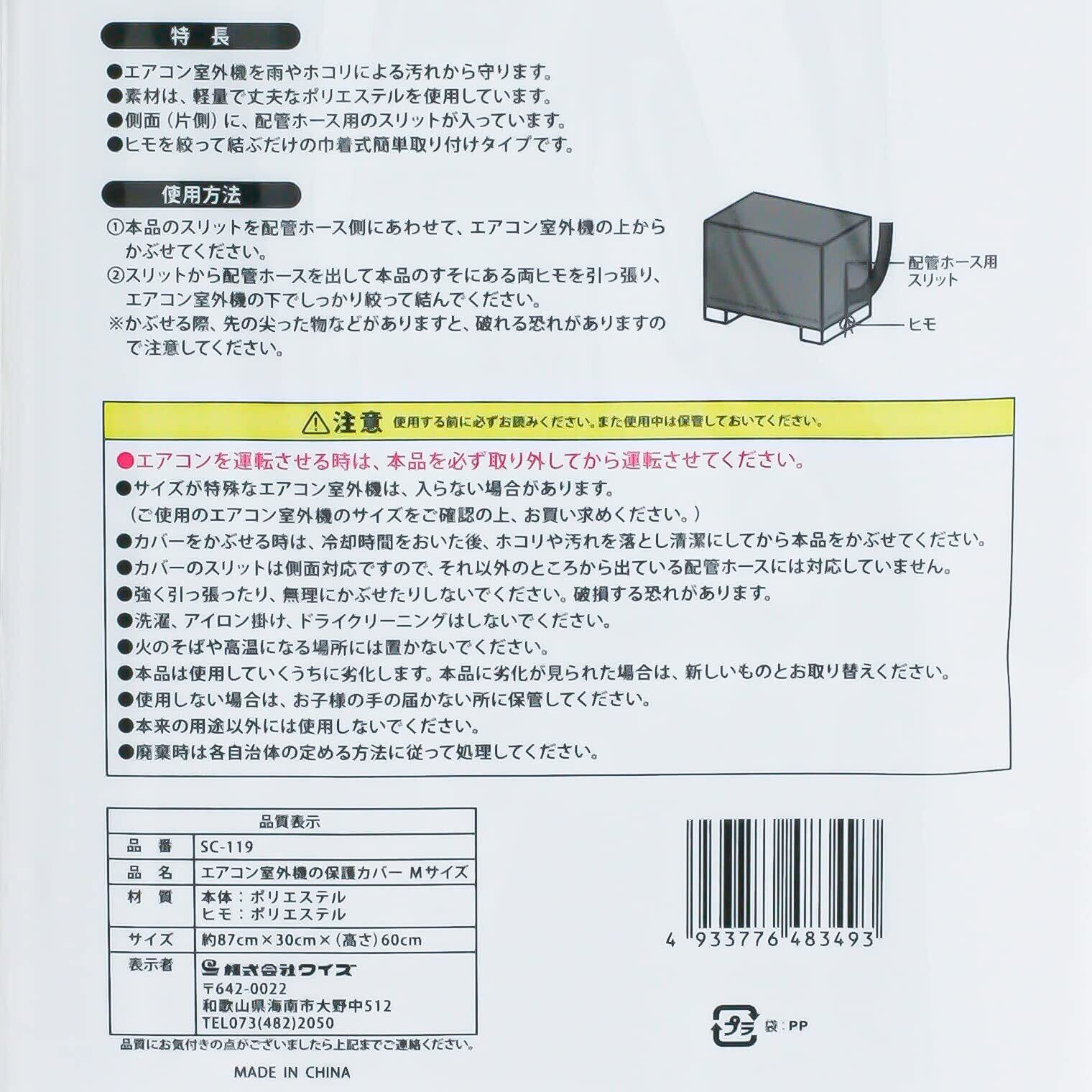 「このワイズエアコン室外機の保護カバーで、大切な室外機をしっかり守りましょう!」/特徴:Mサイズで、87×30×60cmのエアコン室外機に最適なカバーです。