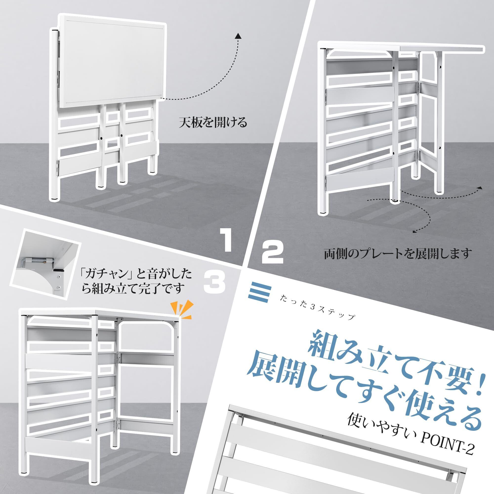 組立不要の設計で、すぐに設置でき手間いらず。折り畳み式なので、使用しないときはコンパクトに収納できます。設置も取り外しも簡単です。