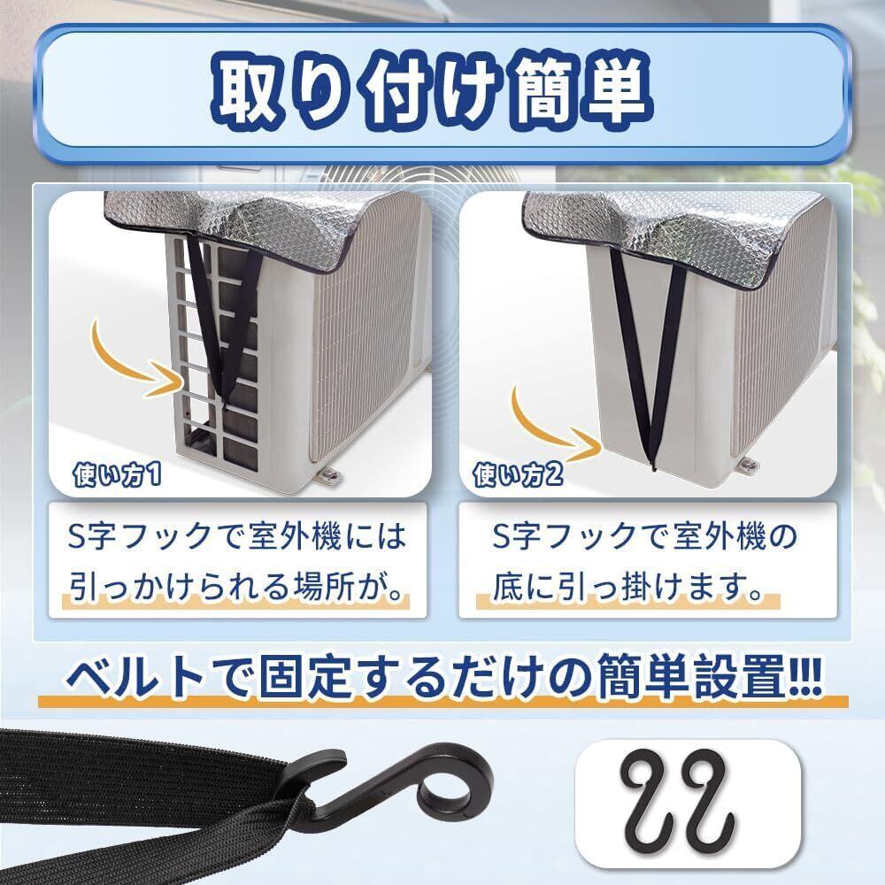【取付け簡単】弾力性のある固定ストラップをを採用し、S字フックで簡単に固定。取り付けは2個のフックを黒いゴムに引っ掛けて、そのフックを室外機側面のひっかかる箇所に掛けます。使い方1: S字フックで室外機には引っかけられる場所が。使い方2: S字フックで室外機の底に引っ掛けます。