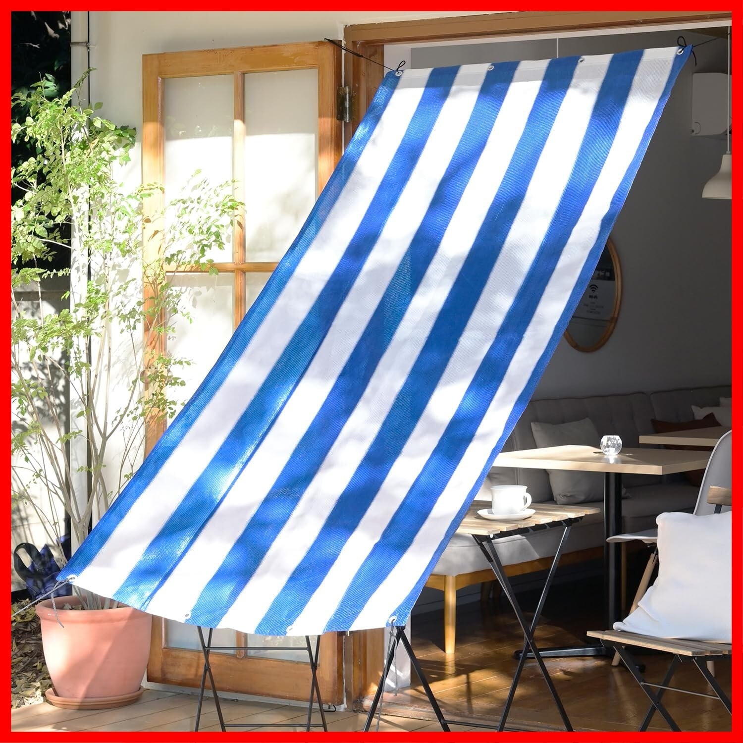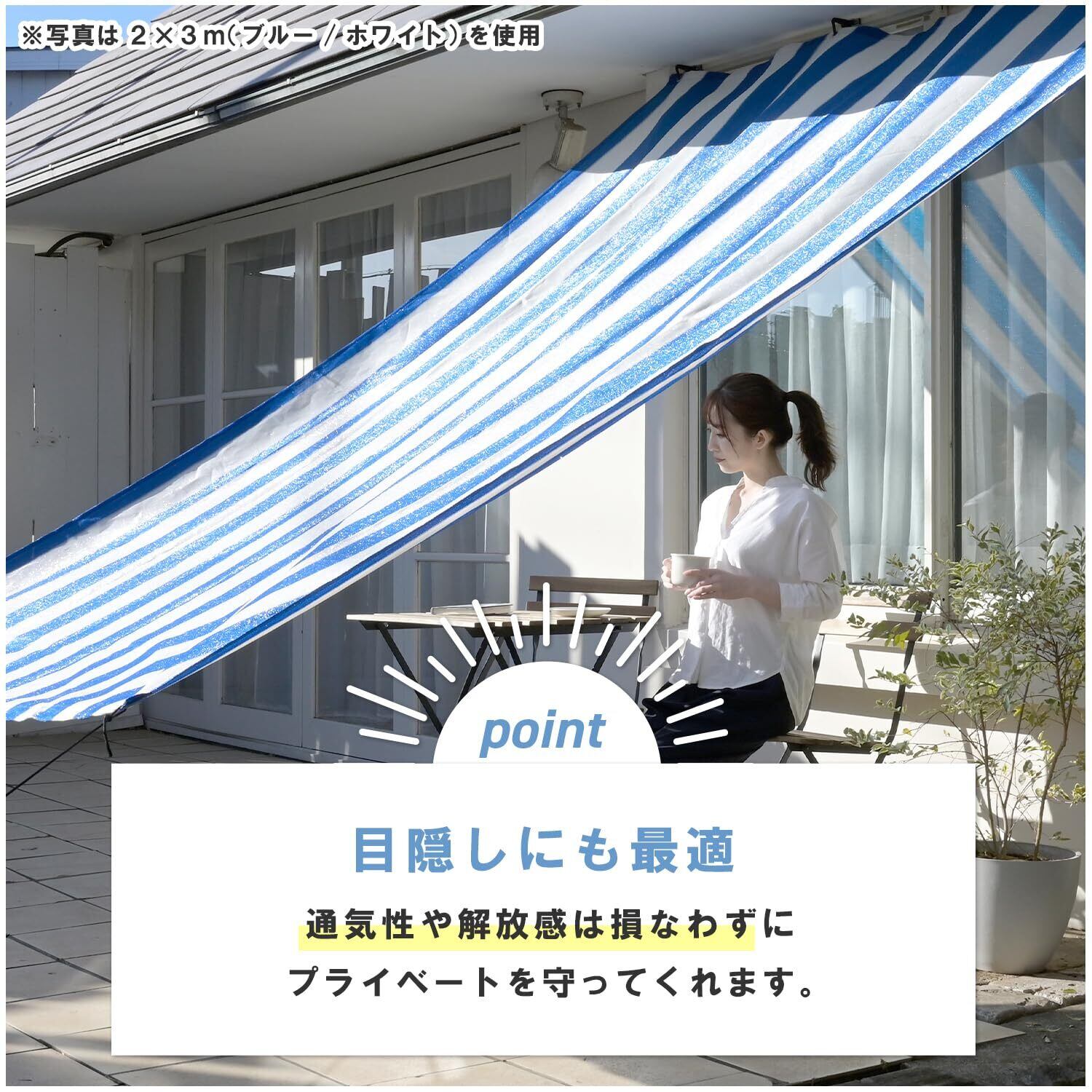 このシェードは、ベランダや窓、庭先などの屋外で大活躍します。スタイリッシュなブルーとホワイトのデザインは、どんなエクステリアにもぴったりなアクセントとなり、魅力を引き立てます。