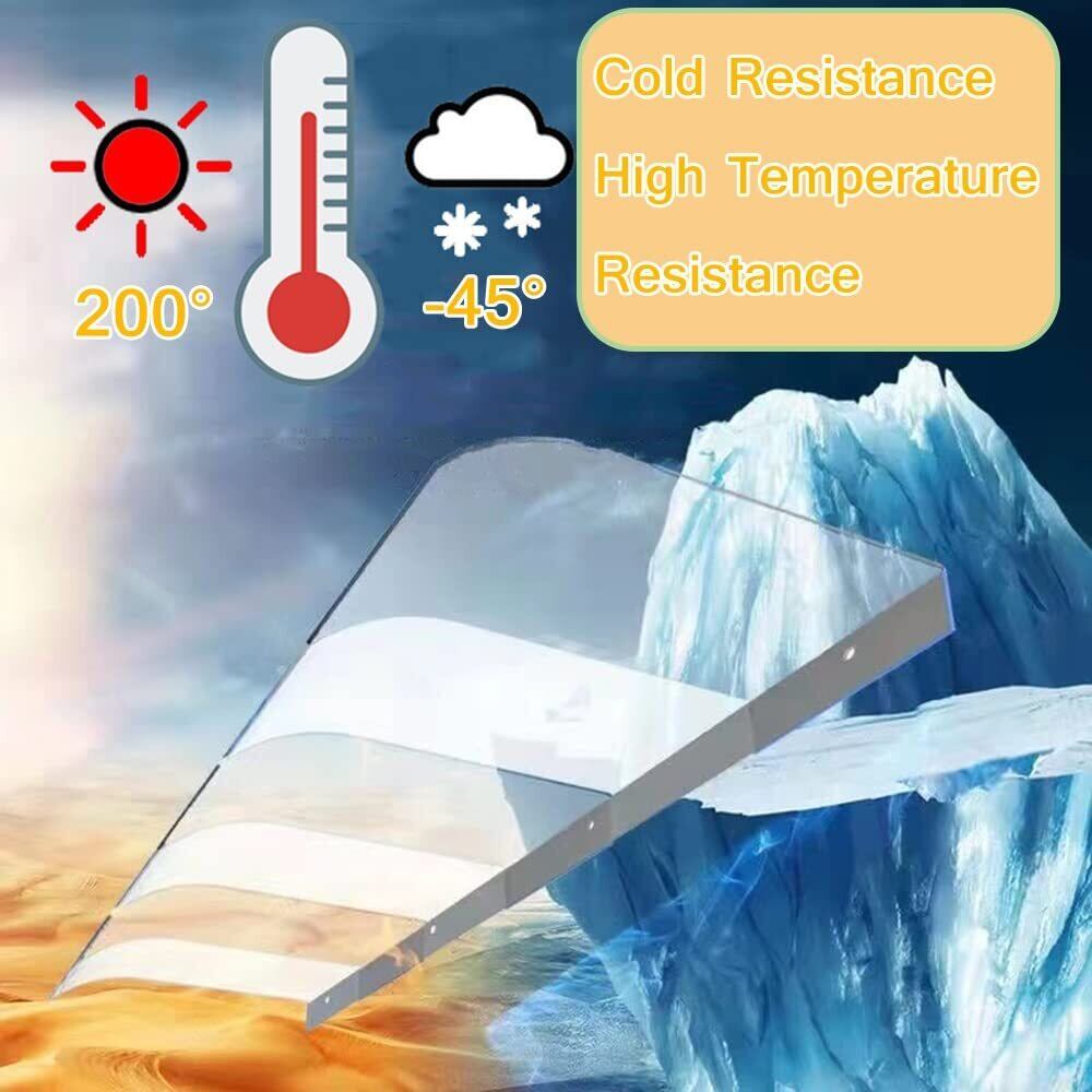 「この屋外ひさしで、あなたの住環境を一層快適に保ちましょう!」/特徴:透明で耐久性の高いポリカーボネート製のひさしは、雨風から大切な家具や空間をしっかりと守ります。