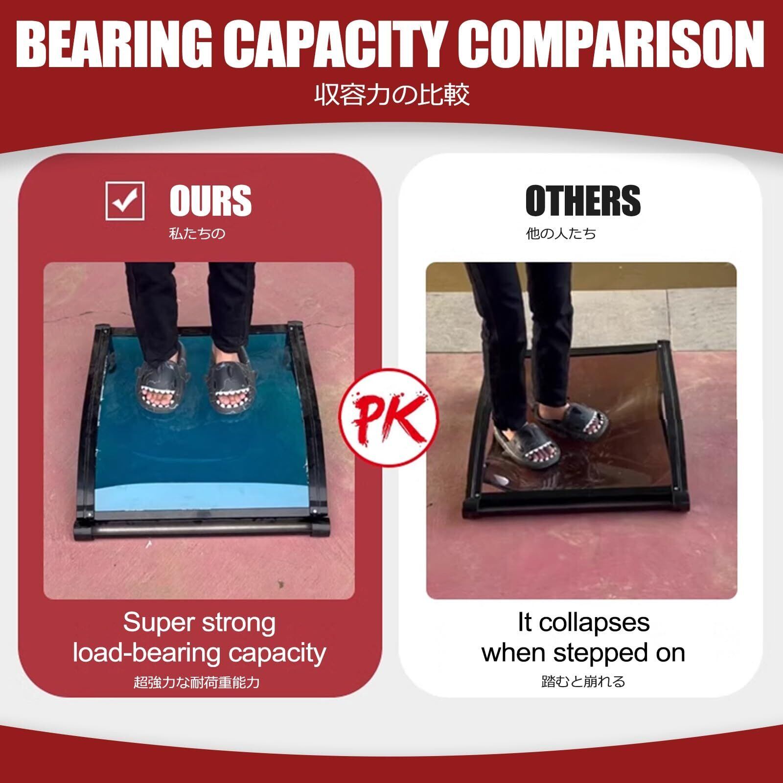 強い耐衝撃性:外装ドアオーニングはPC耐久シートとアルミニウム合金フレームで作られ、ブラケットは炭素鋼ブラケットで作られています。この頑丈なオーニングは、市販の中空オーニングよりもはるかに強力です。突然の重力に耐えることができるので、冬の雪や落下物による損傷を心配する必要はありません。