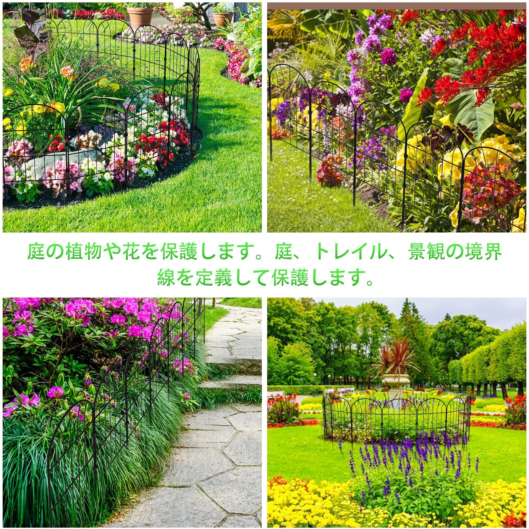 「このMITOUERのアイアンフェンスで、あなたのガーデンスペースを美しく保護しましょう!」/特徴:高さ0.6m・長さ0.32mのフェンスが10枚セットになっており、全長は3.28m。このブラックのアイアンフェンスは、植物や花を守りながら、お庭をおしゃれに演出します。