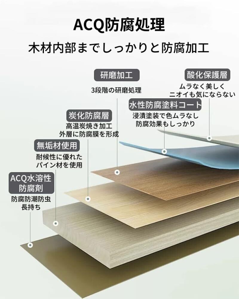 特殊な防水・防腐処理が施された天然木を使用しており、長期間にわたって美しい外観を保ちます。また、UV対策もばっちりなので、直射日光の影響を受けにくいので安心です。シロアリ防止機能も備えており、安心してお使いいただけます。