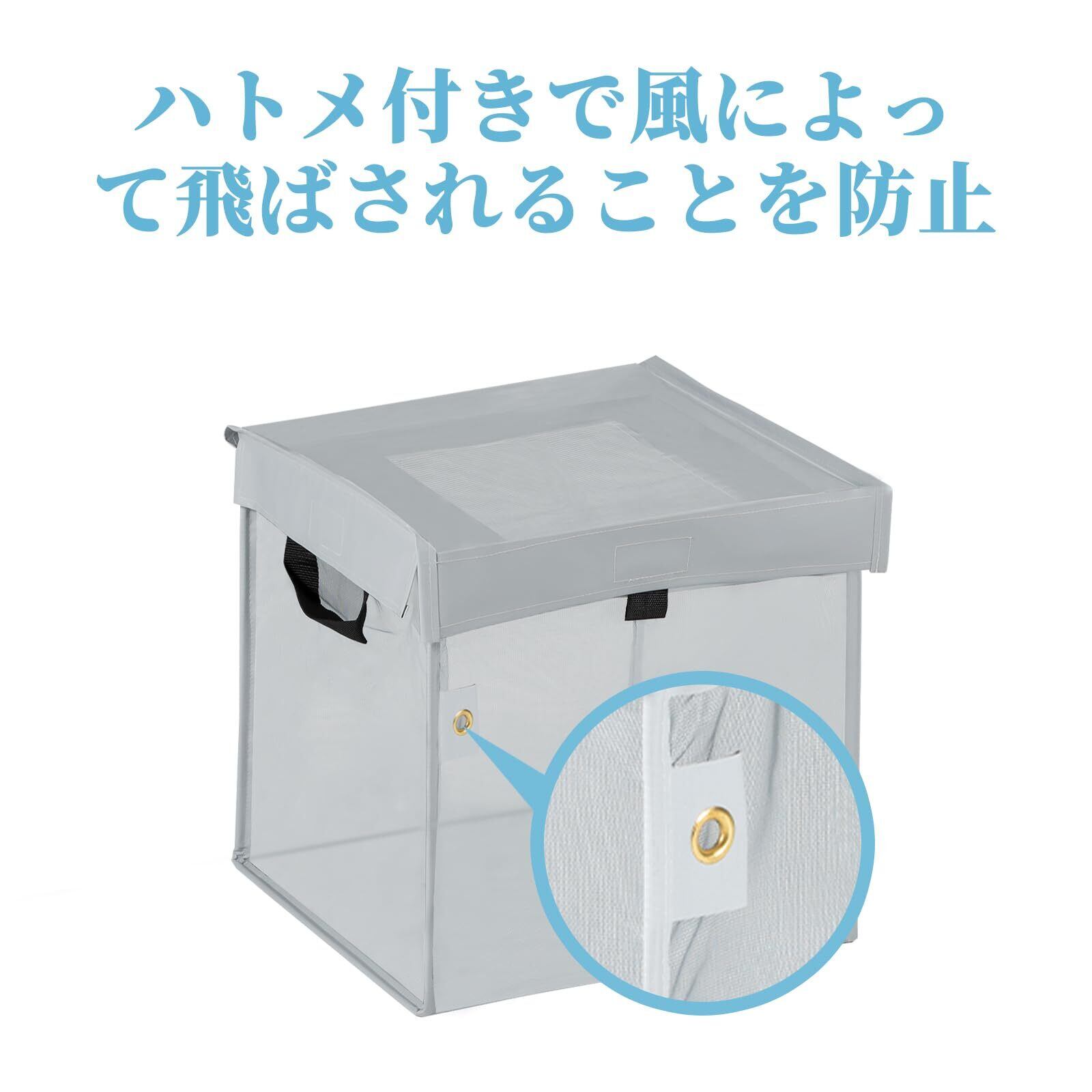 【自立式箱型構造】ボックス型なので、ポリバケツや被せるタイプのゴミネットよりも取り扱いやすい構造となっています。丈夫な骨組みや高密度のネットを採用しており、底中に何も入っていなくても自立でき、カラスよけゴミ箱の型崩れや変形が起こりにくいです。ハトメが付いており、ヒモを通して柱などにしっかり固定でき、台風や強風で飛ばされる心配もありません。ヒモは付属されていませんので、別途ご用意ください