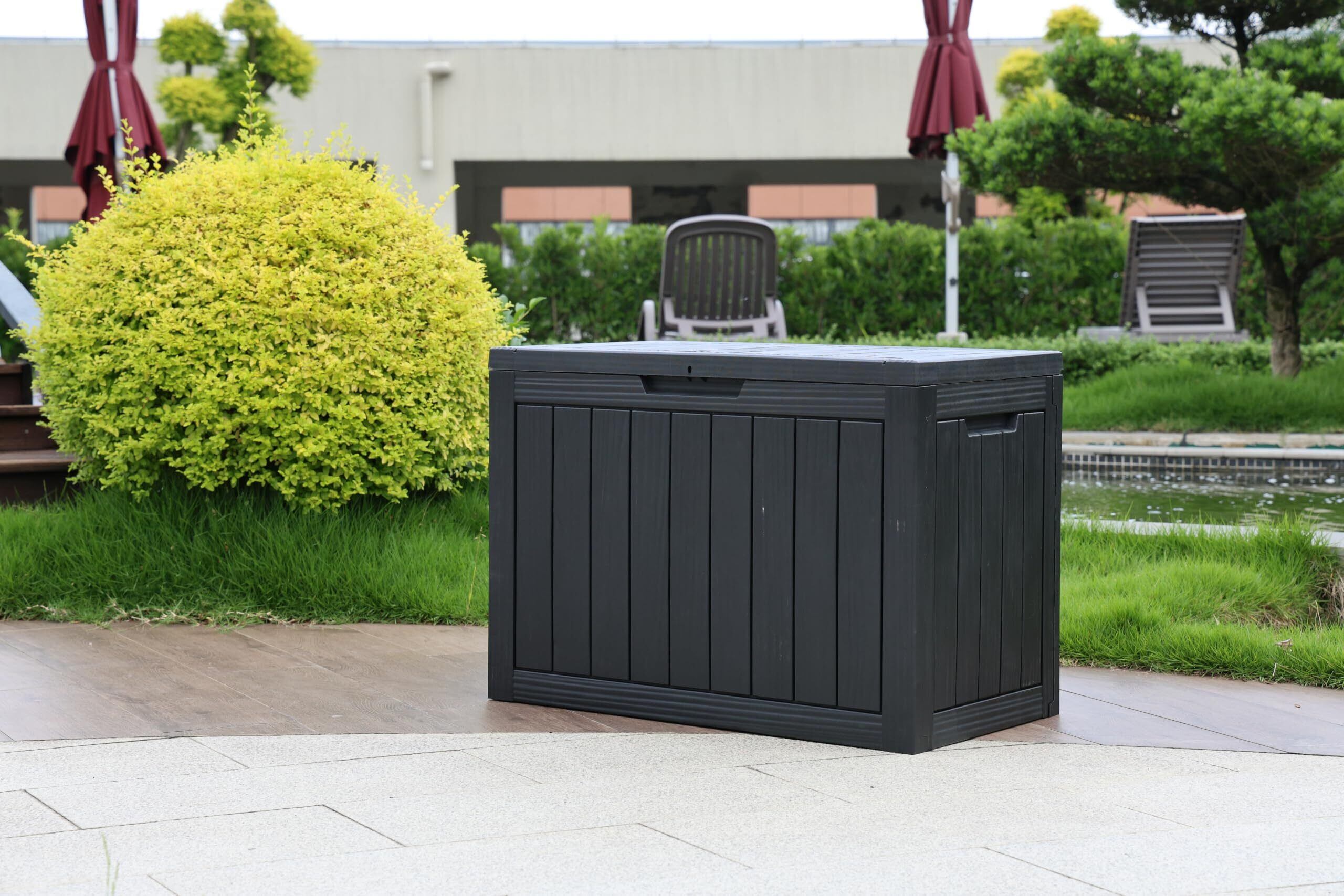 【防水・UV 耐性】全天候耐性のプラスチック素材により、このメンテナンス性の低いパティオ用収納ボックスは使いやすく、今後長年にわたって活用できます。本物の木材とは異なり、厚手の外装レジンが錆び、剥がれ、へこみを防ぎます。