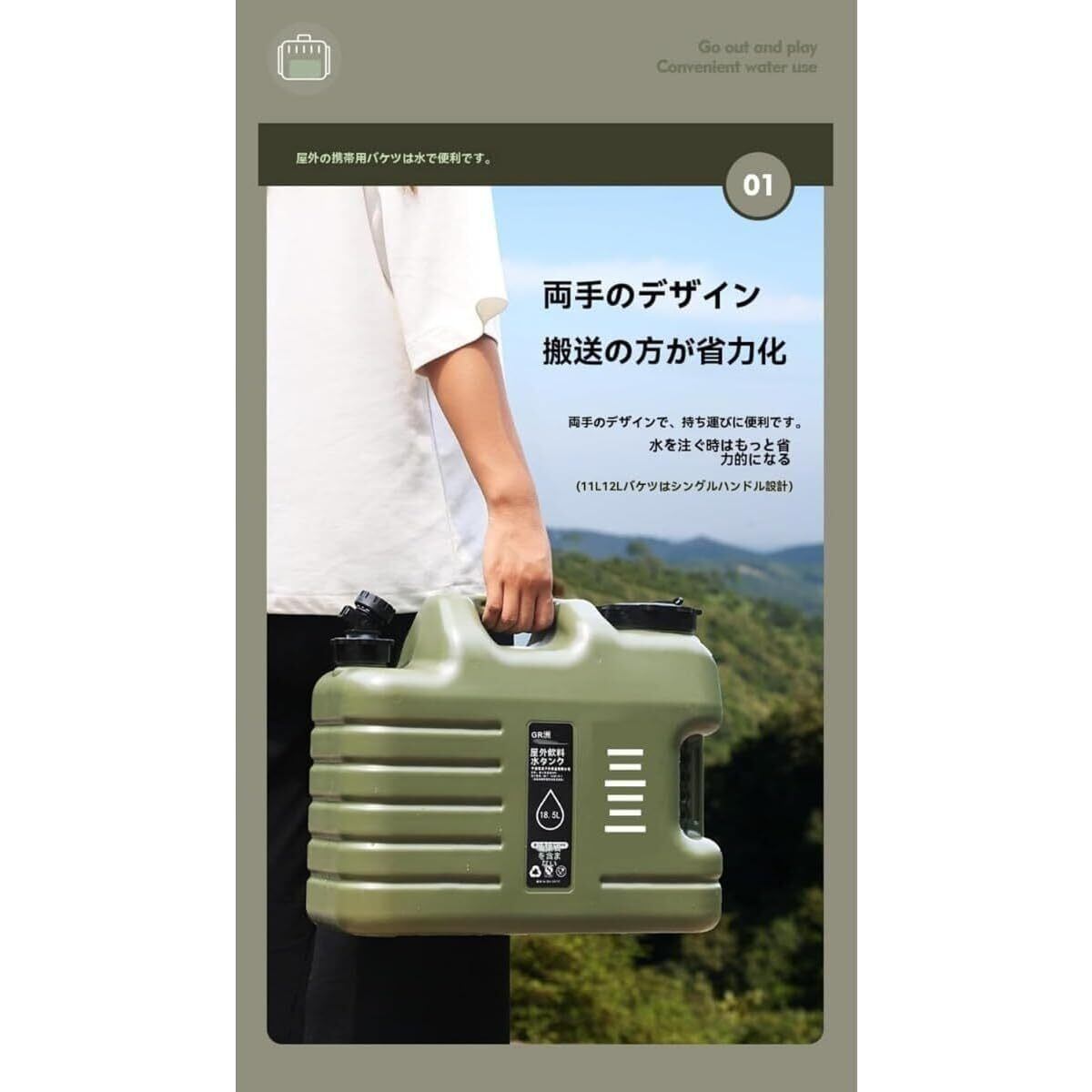 「このFiveLnウォータータンクで、アウトドア活動をより快適に、そして安心にしましょう!」/特徴:キャンプやハイキングなど、さまざまなシーンに最適な5Lと11Lの大容量ポリタンクが登場しました。