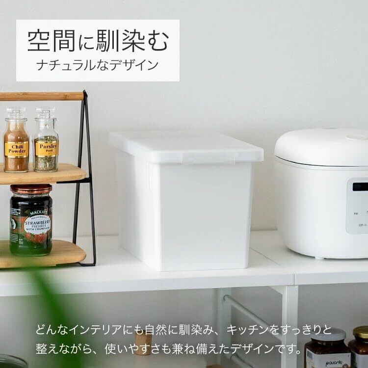 この米びつは、パッキン付きのロック機構でしっかりと密閉でき、お米を湿気や虫から守ります。必要な分だけ簡単に取り出すことができる設計で、日常使いに最適です。また、フタのデザインもシンプルで開閉が楽に行えます。