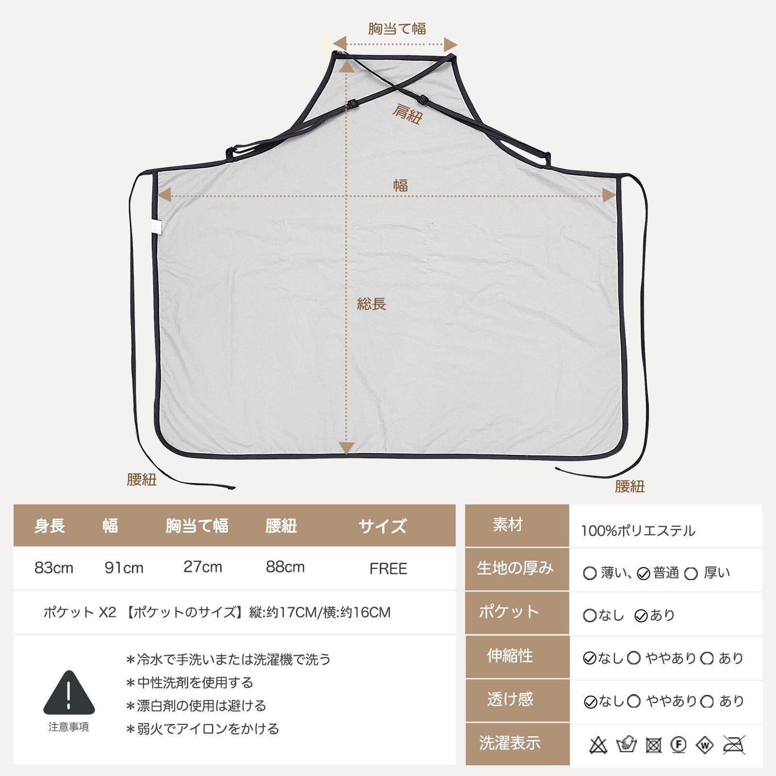 本エプロンには撥水加工が施されており、食材や水からしっかりと身を守ります。さらに、防シワ加工が施されているため、常にキレイな状態でお使いいただけます。日常使いにぴったりのアイテムです。