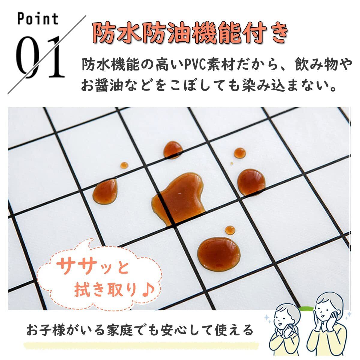 撥水性に優れたPVC素材を使用しており、こぼれた飲み物や食べ物が染み込みにくく、簡単に拭き取ることができます。耐熱性も備えているため、料理をテーブルに直接置いても安心です。