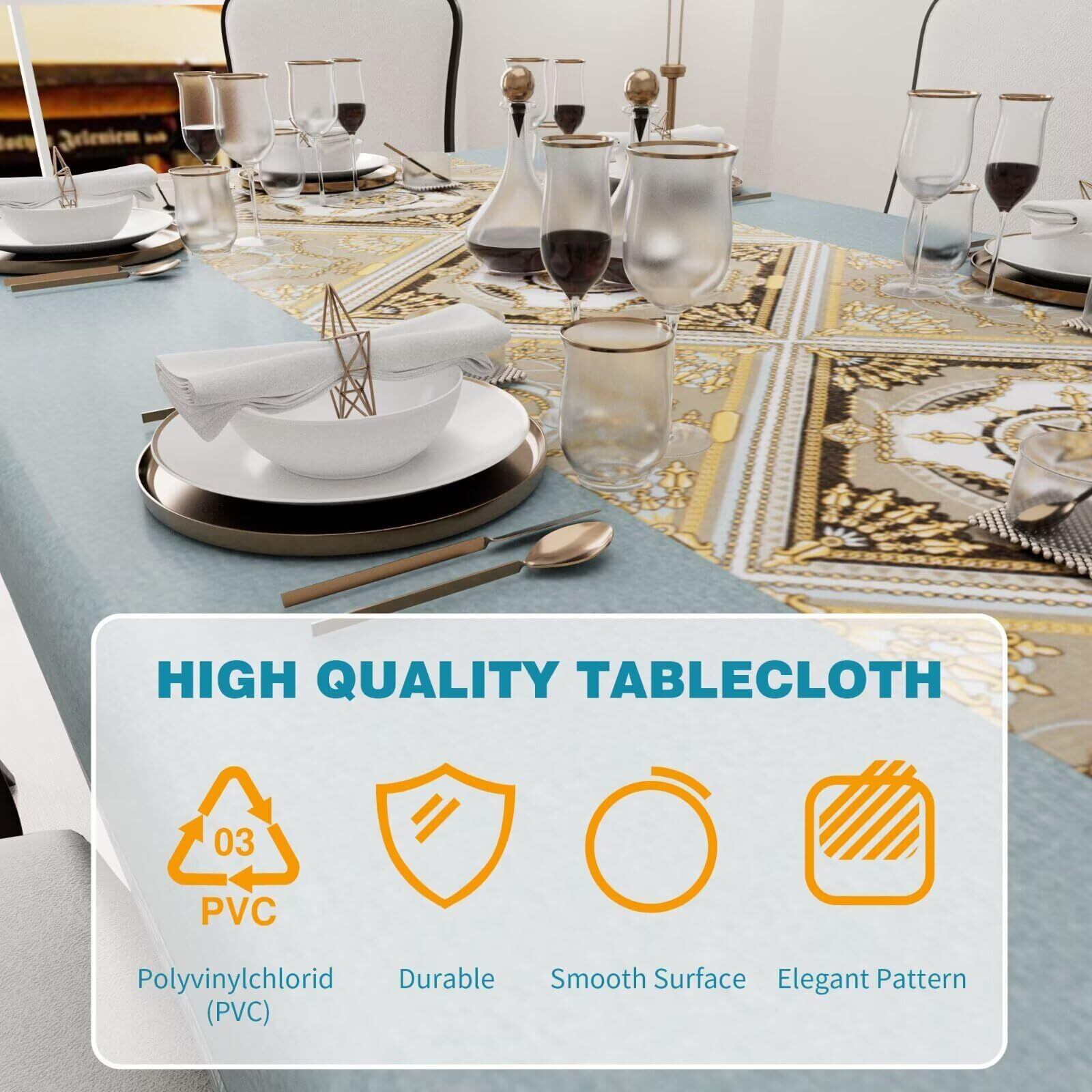 「このヘイズブルーのテーブルクロスで、スタイリッシュな空間を演出しましょう!」/特徴:落ち着いたヘイズブルーの色合いが、室内外を問わず、特別な雰囲気を醸し出します。ダイニングルーム、庭、さらにキャンプの場面でも、あなたのテーブルを華やかに彩ります。