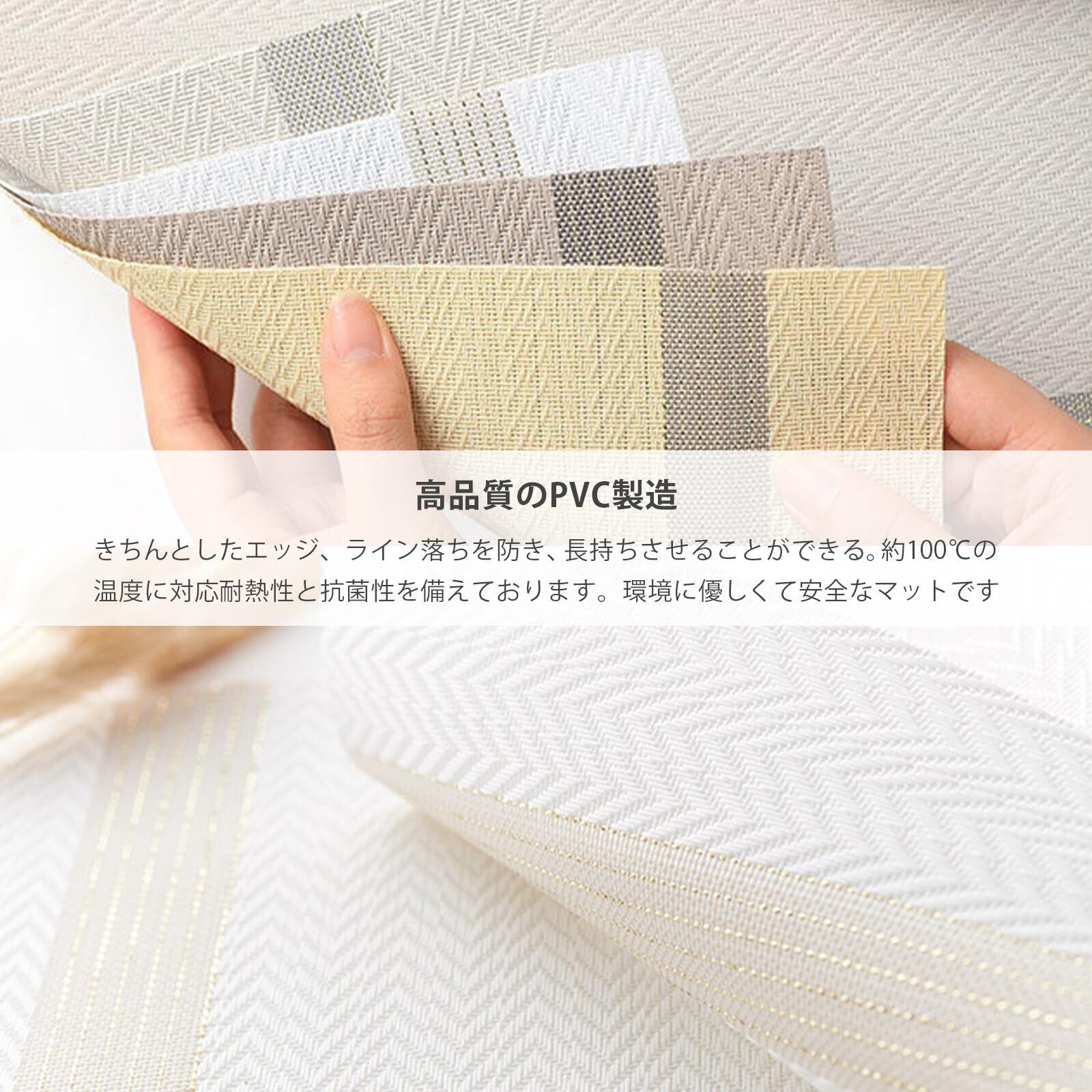 PVC素材を使用し、防汚性と耐水性に優れています。汚れがついてもサッと拭き取ることができるため、お手入れもとても簡単です。また、滑り止め加工が施されており、食器やカップをしっかりと支えます。さらに、断熱効果があり熱い皿を安全に置くことができます。