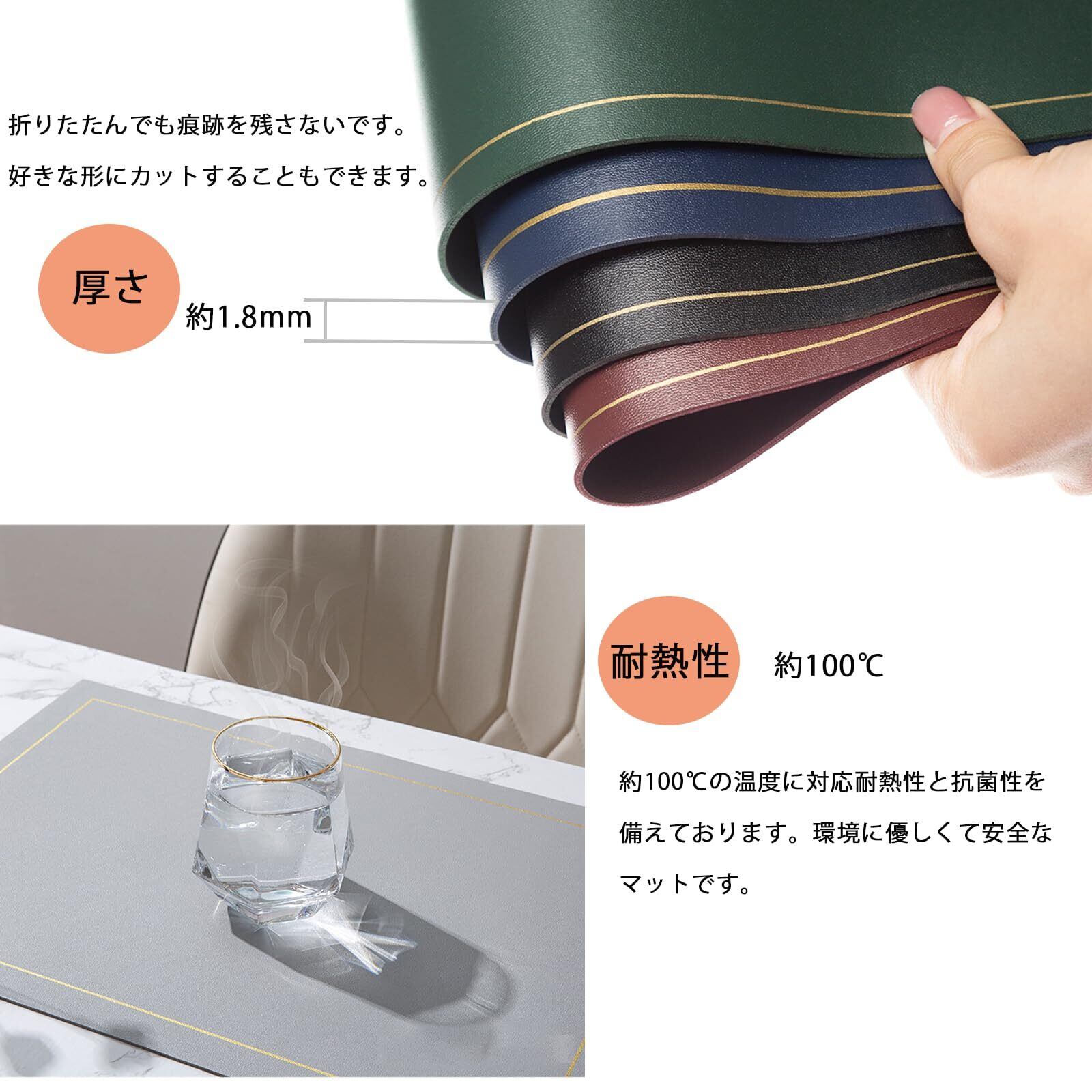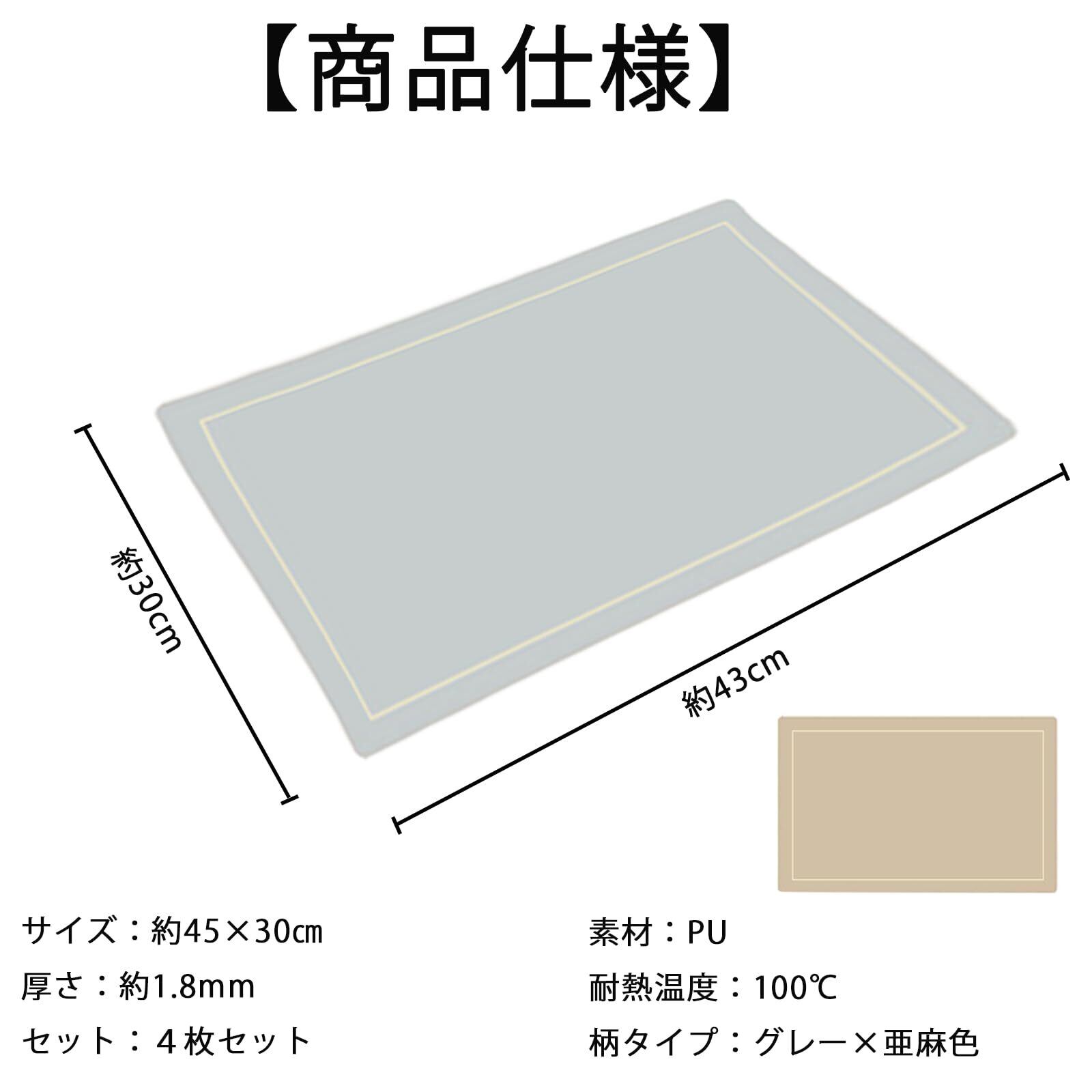 【商品仕様】サイズ:(約)45×30㎝、薄さ約1.8mm、重さ(1枚当たり):約120g、セット:4枚セット、耐熱温度:(約)100℃ 、柄タイプ:グレー×亜麻色 素材:レザー製、合成皮革製、両面使用。高耐久で滑らない、無臭。