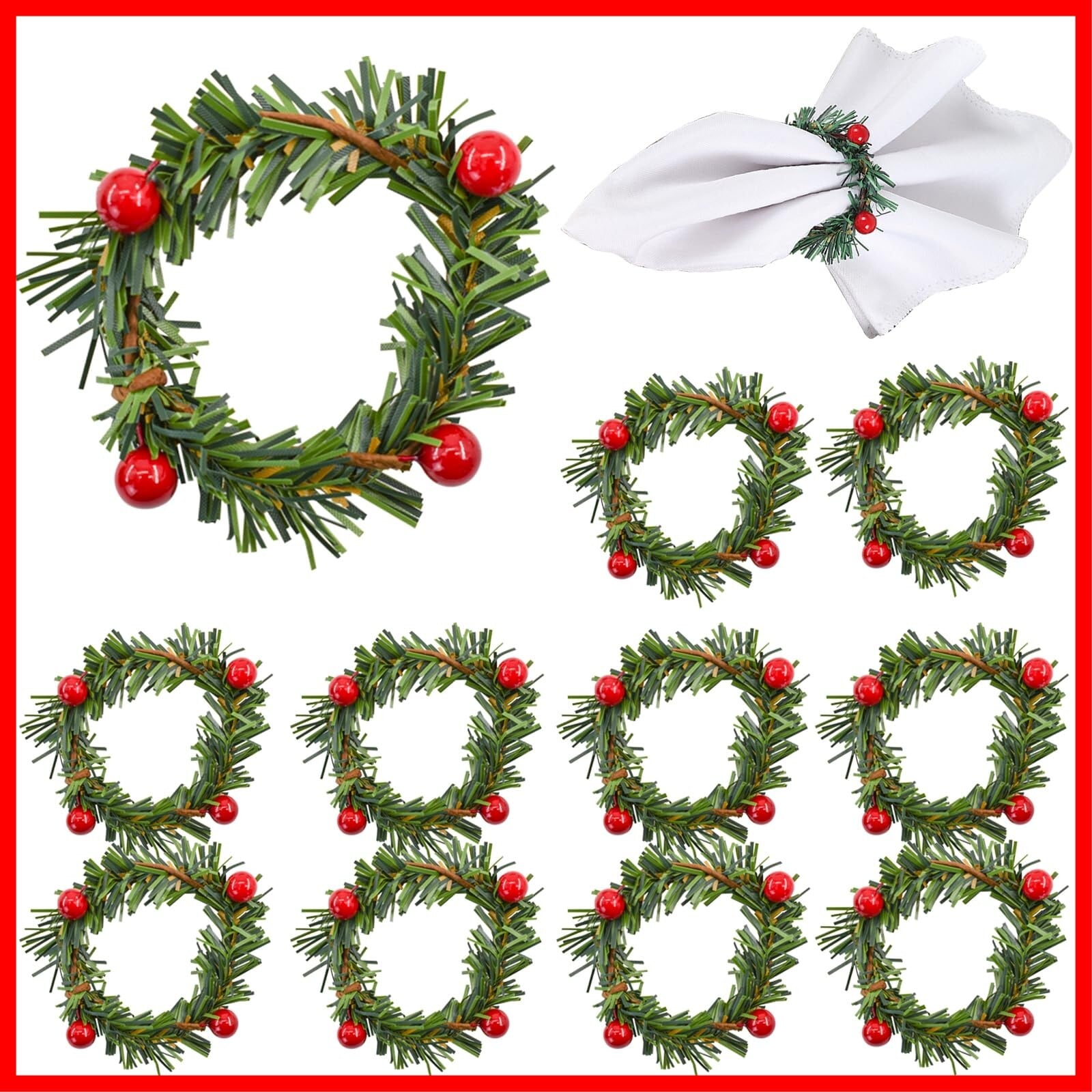 「この『Bacucine ナプキンリング』で、クリスマスのテーブルセッティングを華やかに演出してみませんか!」/特徴:美しい人工松ピックとレッドベリーがあしらわれたナプキンリング12個セットは、クリスマスや特別なイベントを華やかに彩ります。どんなテーブルにもぴったりな装飾アイテムです。