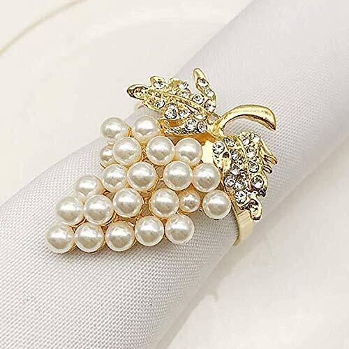「この『きらびやかな模造ダイヤモンドと真珠の象眼細工のナプキンリングセット』で、特別なディナーやパーティーをさらに華やかに演出してみませんか!」/特徴:美しい模造ダイヤモンドと真珠の細工が施されたこのナプキンリングセットは、6個のブドウデザインが含まれており、エレガントなテーブルセッティングにぴったり。特別なイベントや普段の食卓に贅沢な雰囲気を添えます。