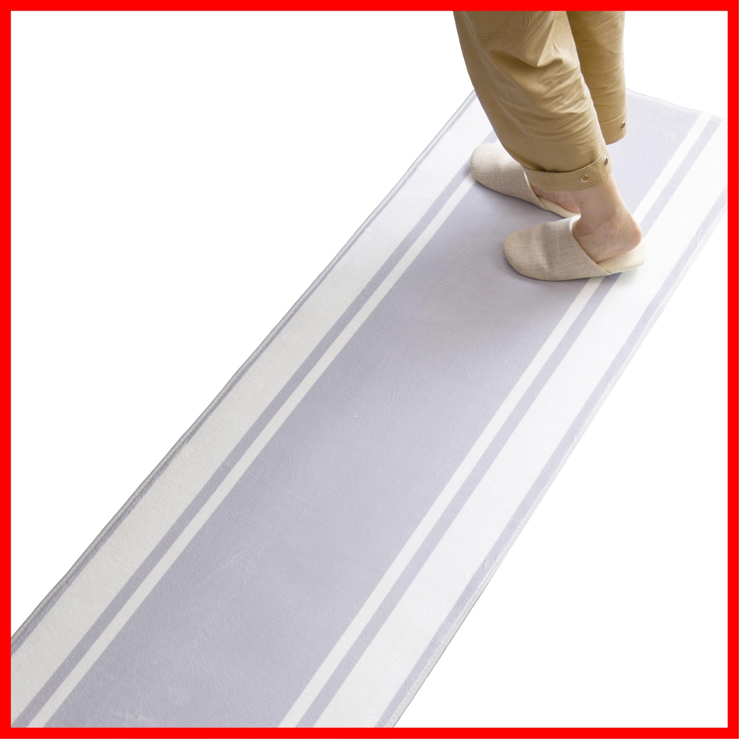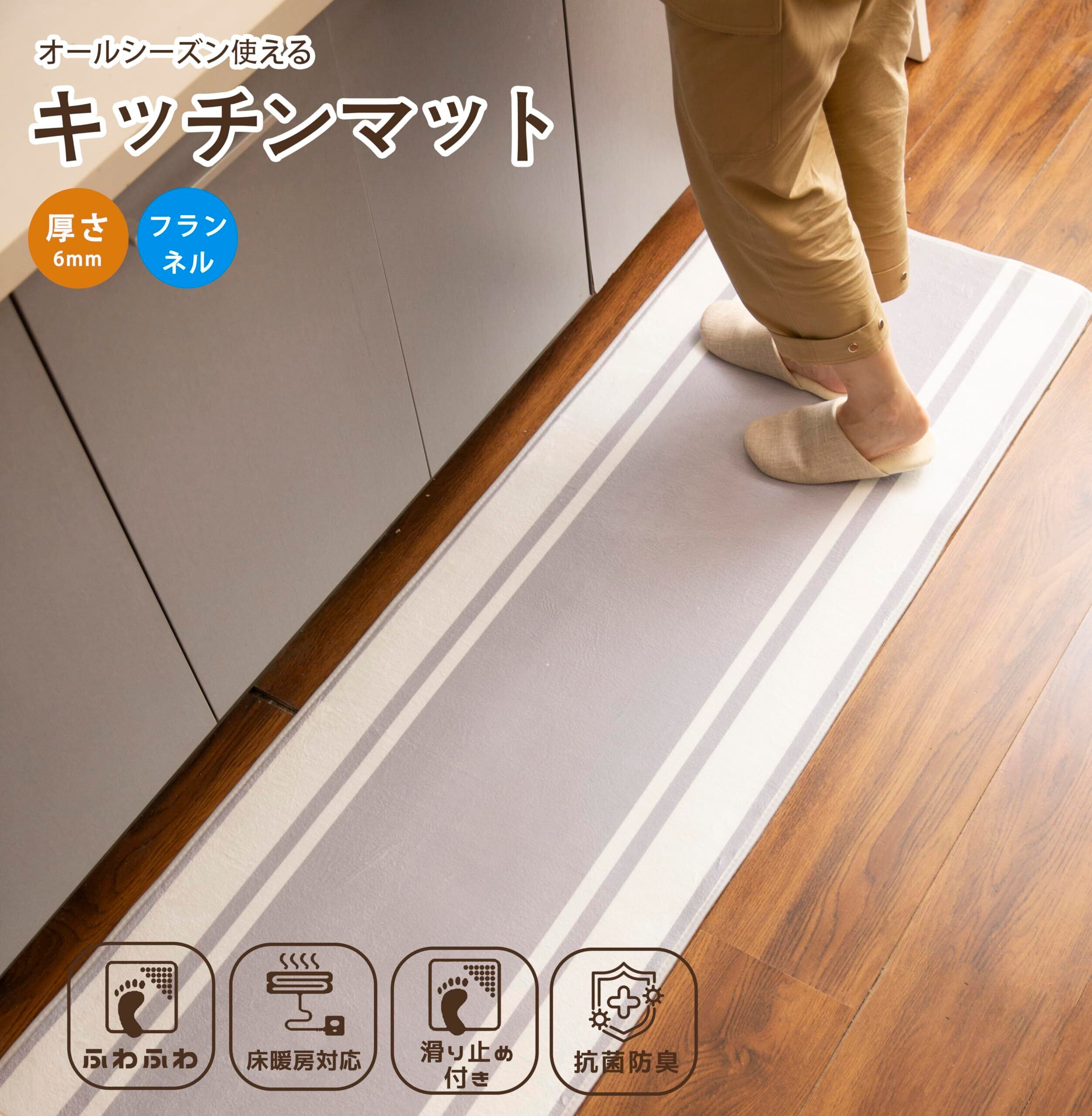【新着商品】キッチンマット 台所マット 60×180㎝ 微はっ水 ホットカーペット対応 フランネル ふわふわ 北欧 ボーダー柄・グレー
