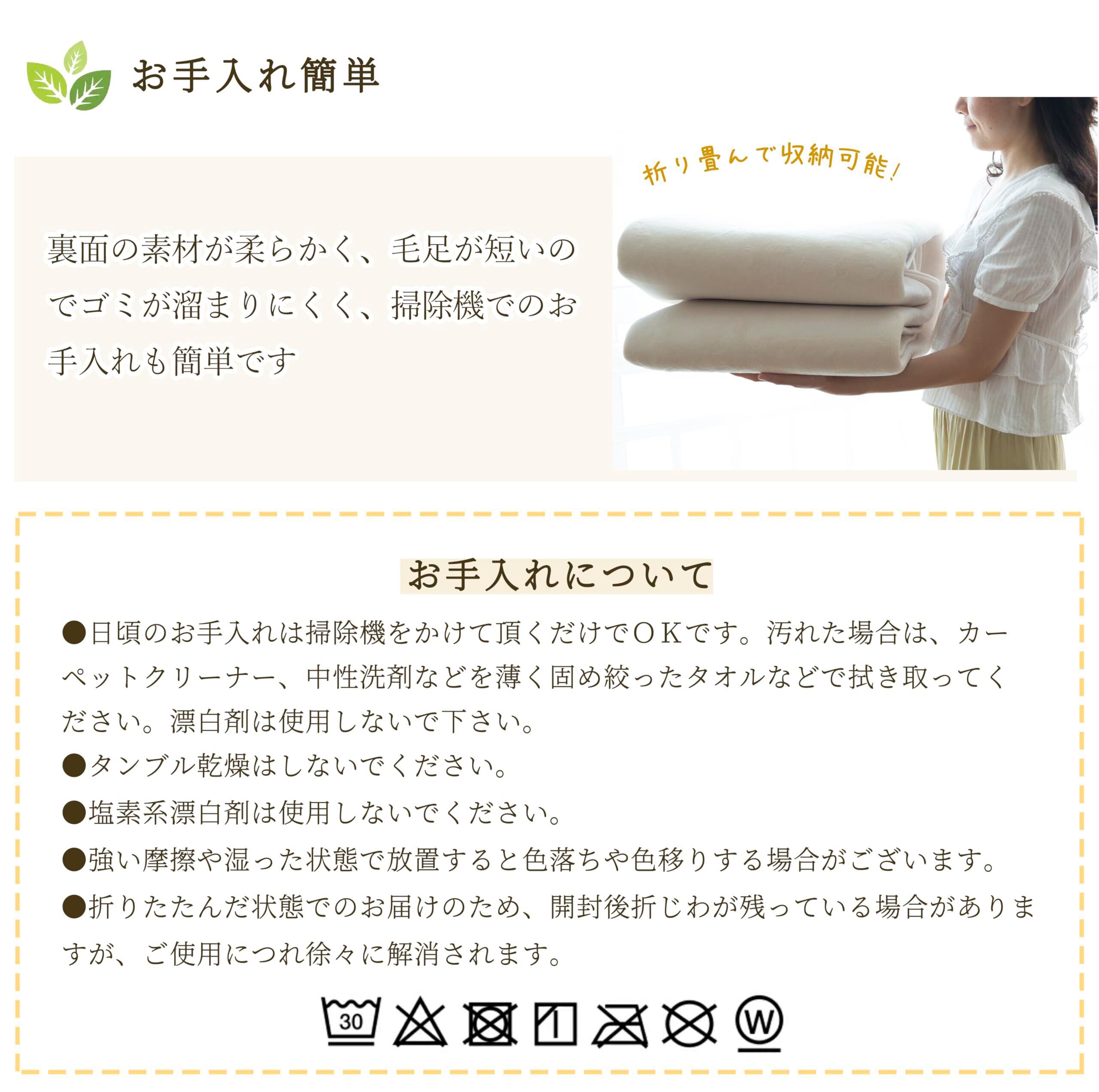 【丸洗いOK・お手入れも簡単】裏面の素材が柔らかく、軽いので折りたたんで洗濯機で丸洗い可能。※洗濯機使用の際は洗濯ネットに入れてください。毛足が短いのでゴミが溜まりにくく、掃除機でのお手入れも簡単です。