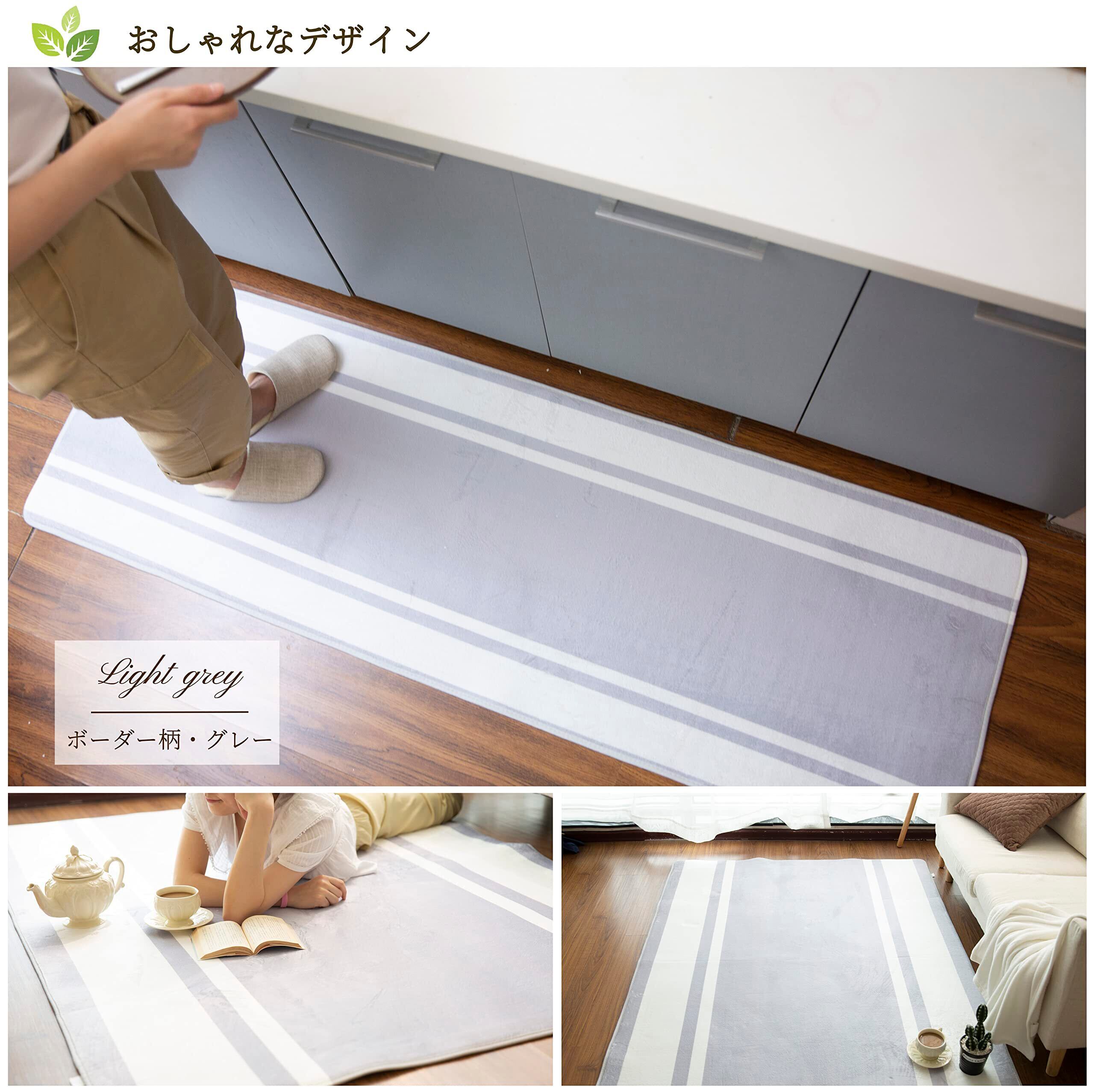 キッチンマット 台所マット 60×180㎝ 微はっ水 ホットカーペット対応 フランネル ふわふわ 北欧 ボーダー柄・グレー