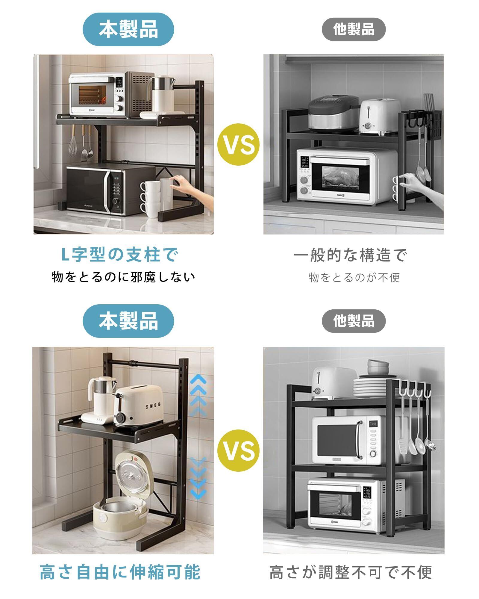 ️幅と高さの調節️幅と高さは調整可能で、さまざまなレンジや家電のサイズに合わせて使えます。電子レンジやオーブンの収納に最適で、調味料やキッチン用品も綺麗に収納できます。