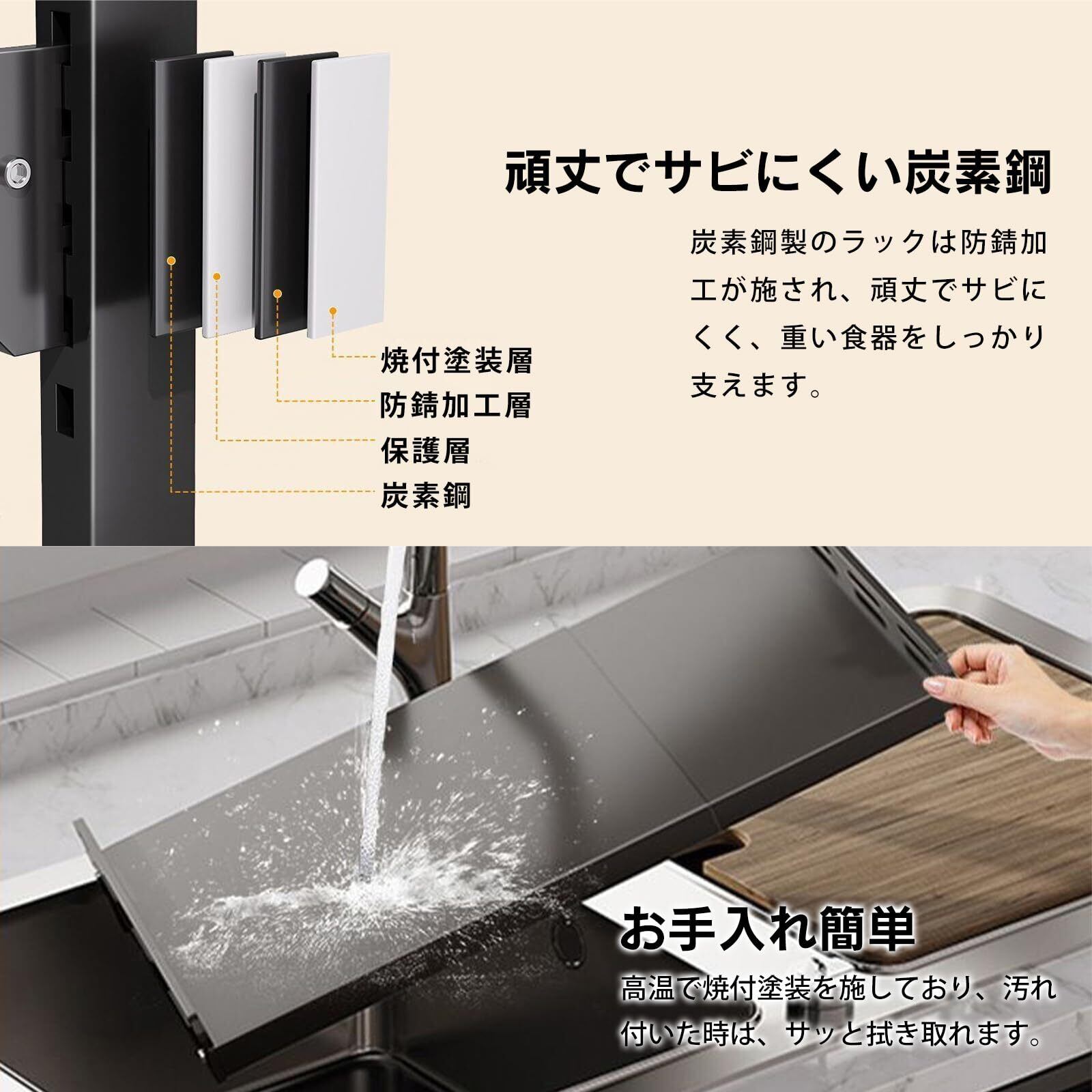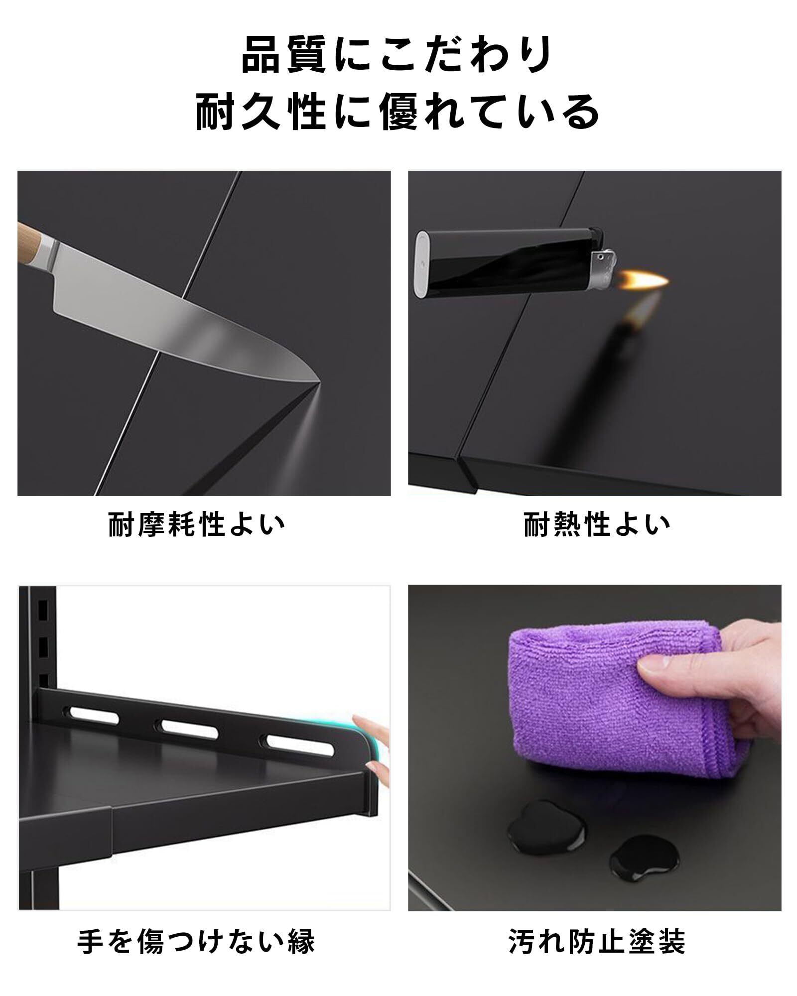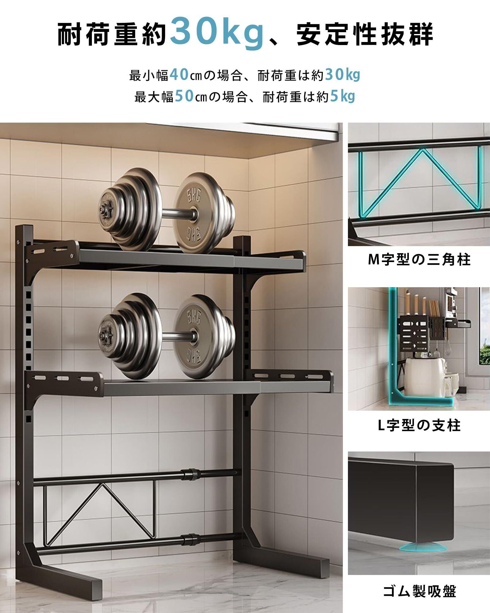 優れた品質と耐荷重高品質なカーボンスチールと高温焼付塗装で、汚れを拭き取るだけで清潔に。耐荷重は最小幅で30kg、最大幅で5kgです。小型家電や他のアイテムを安心して置くことができます。