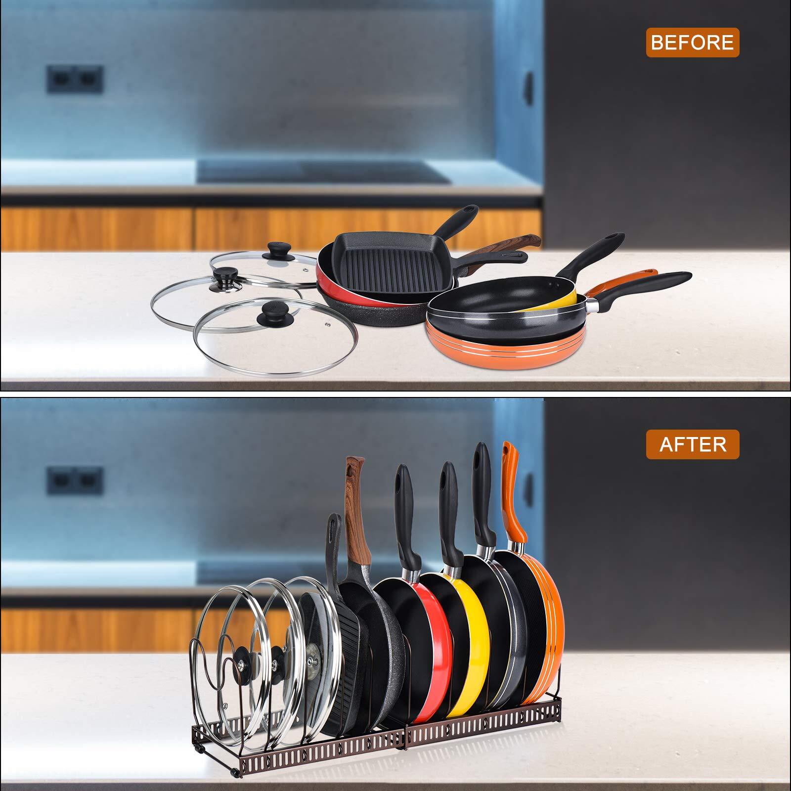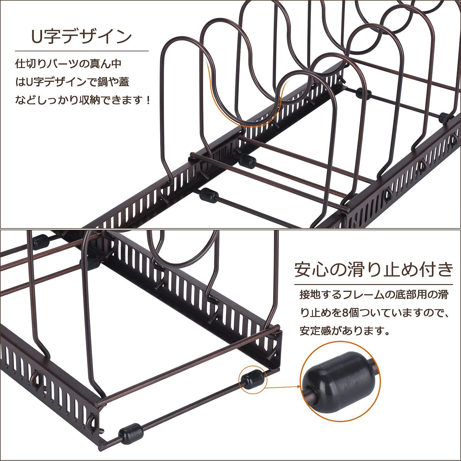 Toplife伸縮式 フライパンラック キッチン収納ラック 10本仕切りパーツ付き 鍋スタンド フライパン 鍋 蓋置き(ブラウン)