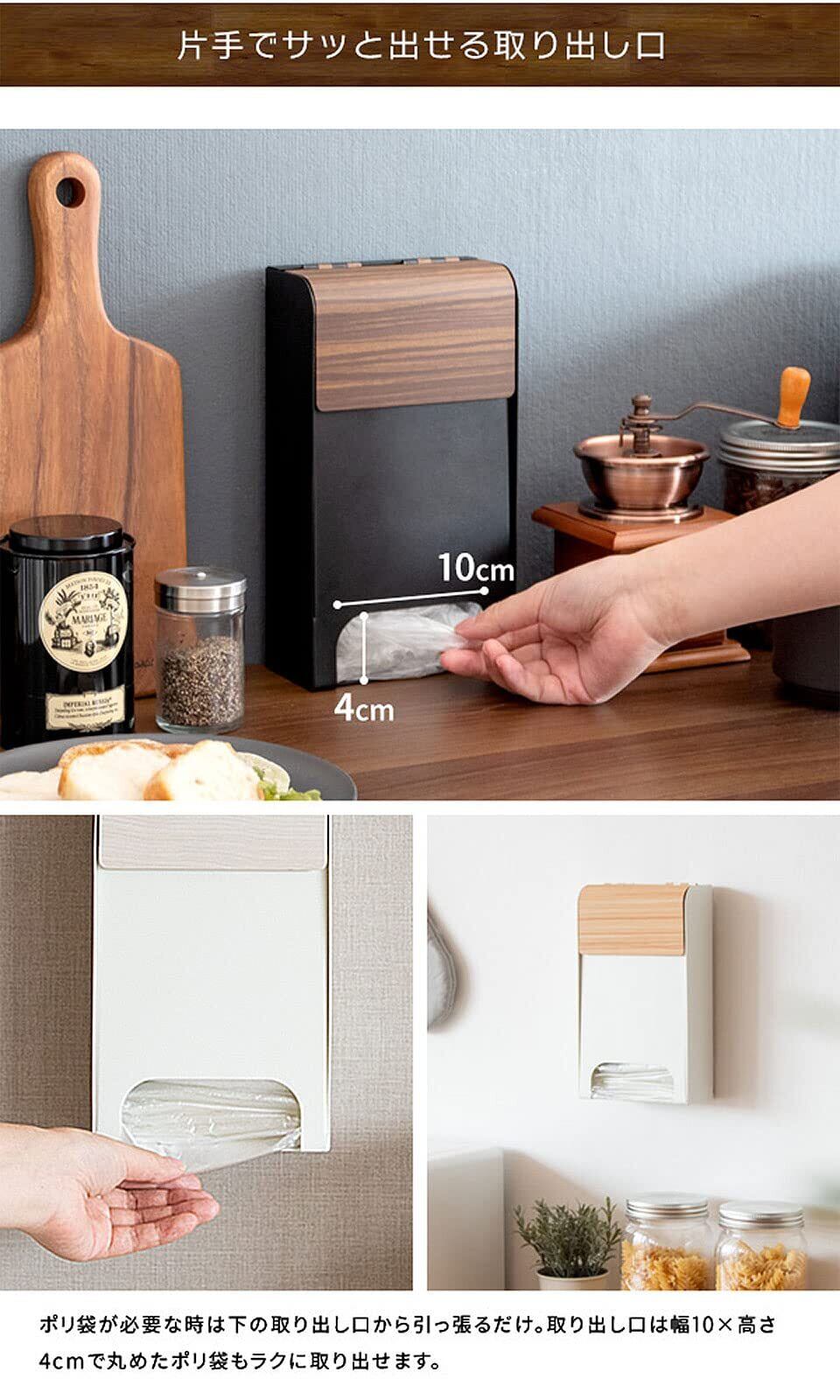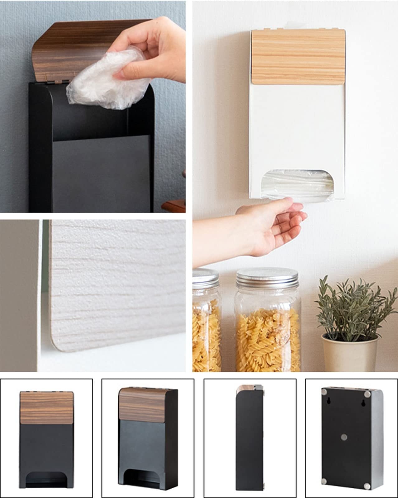 上部のフタを開けて袋を入れて、必要な時は下から取り出すだけ。設置方法もマグネット、壁掛け、スタンドと選べるのでキッチンの空いたスペースに置けます。