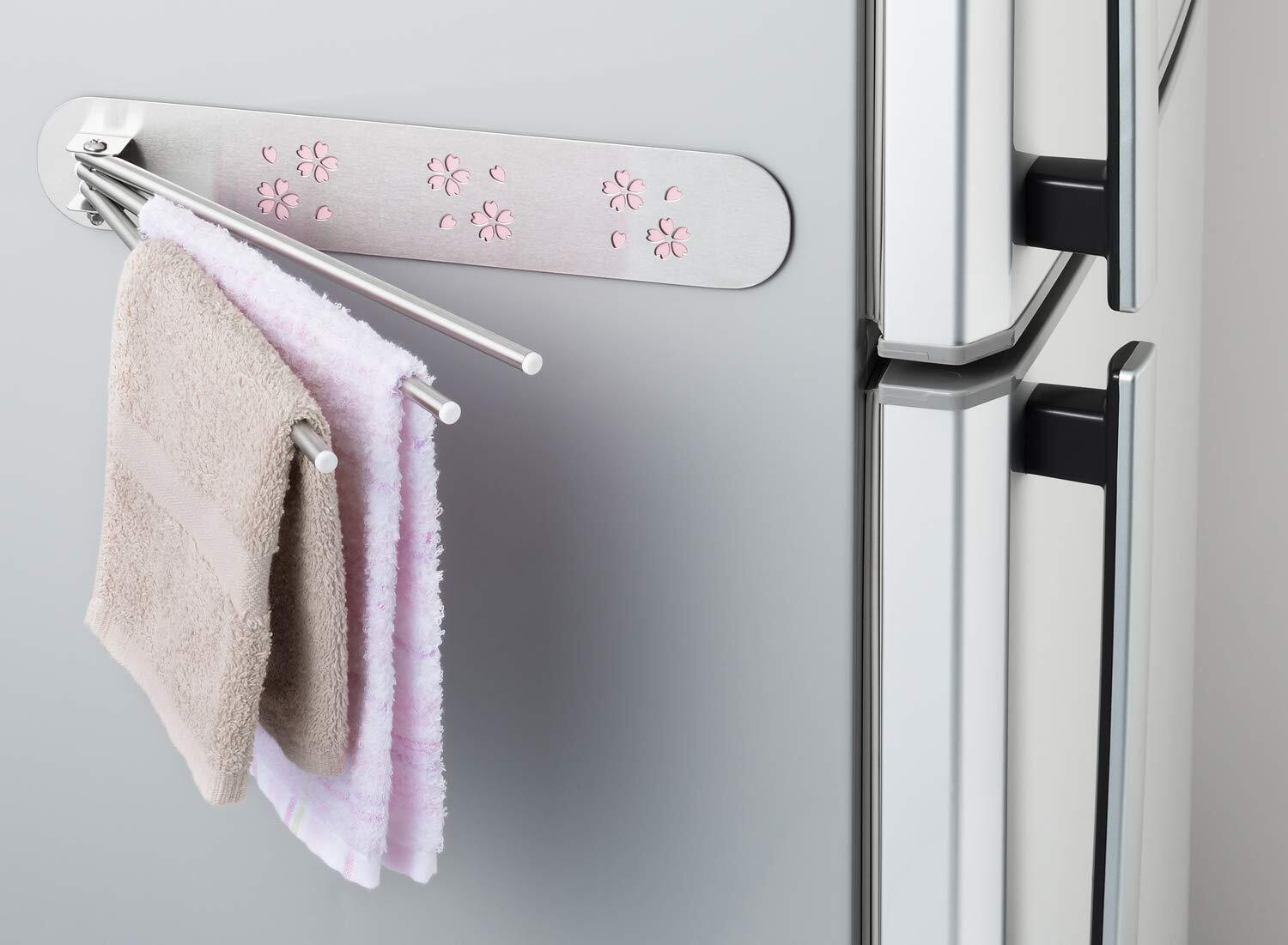 「この『ヨシカワ ステンレス製ふきん掛け』で、あなたのキッチンをさらに魅力的に仕上げてみませんか!」/特徴:エレガントな桜デザインが印象的なこのふきん掛けは、シルバーのステンレス製で、インテリアにも自然に溶け込みます。強力な耐荷重機能を持ち、しっかりとふきんを保持しますので、使い勝手が非常に良いのが特徴です。