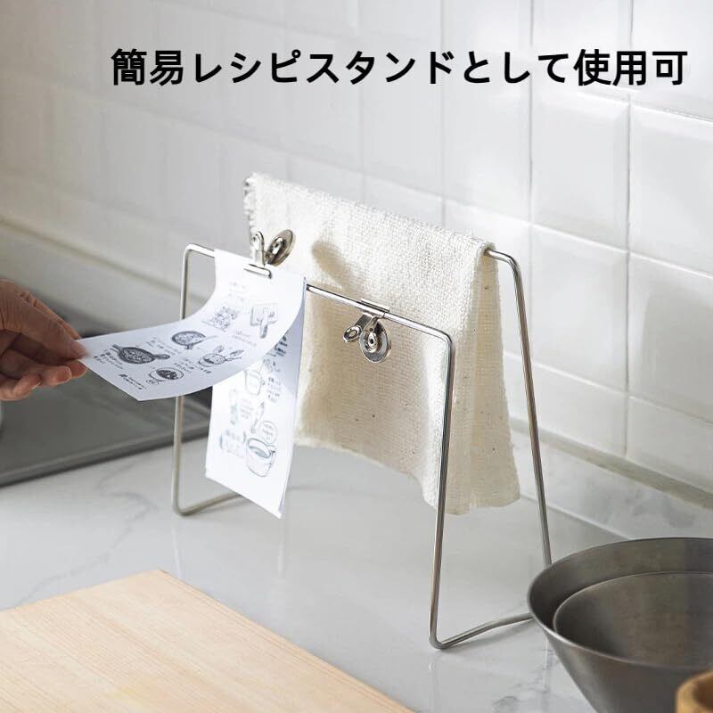 「この『布巾スタンド』で、あなたのキッチンをより整理された空間にしてみませんか!」/特徴:スタイリッシュな北欧デザインが魅力的なこのふきんスタンドは、ステンレス鋼製で耐久性があり、サビに強いのが特徴です。料理の合間にふきんをサッと掛けて、乾燥させるのに最適なアイテムです。