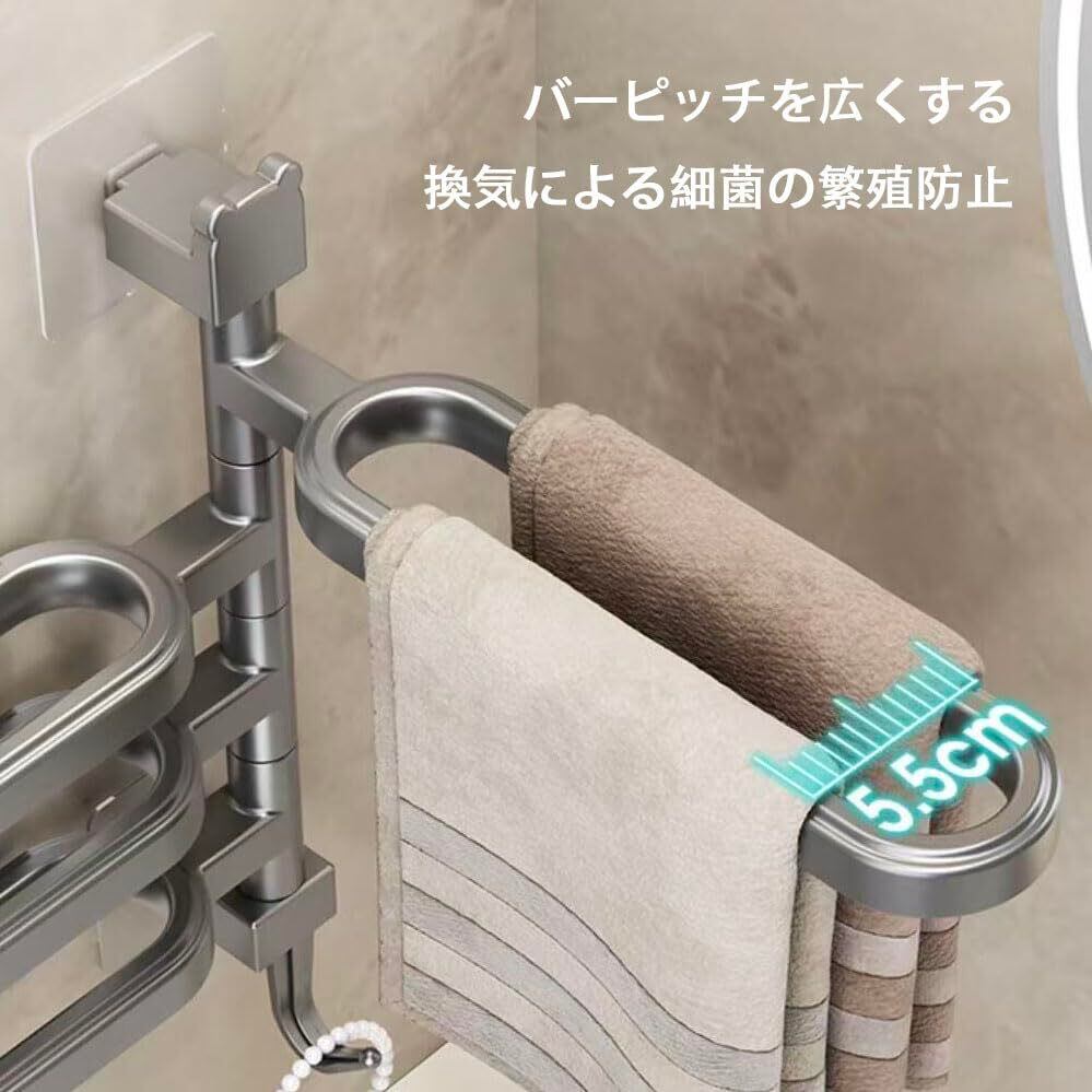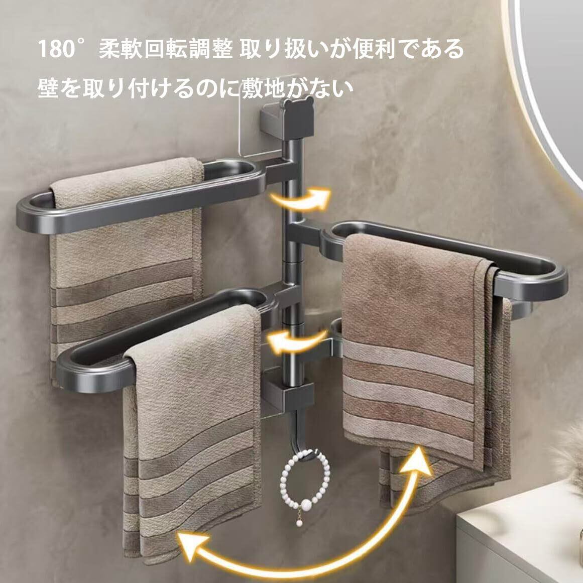 「この『タオルハンガー』を使って、あなたのキッチンやバスルームをよりスタイリッシュで機能的な空間に変えてみませんか!」/特徴:洗練されたホワイトとグレーのデザインが魅力的なこのタオル掛けは、4連の回転式で、180度調整可能なため、さまざまな場所での使用に最適です。耐水性と防錆機能も備えており、キッチンやバスルームで清潔に保つことができます。