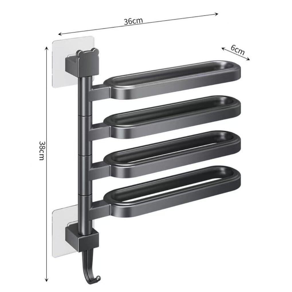 こちらの回転式4連タオル掛けは、効率的な収納と快適な使い勝手を兼ね備えたアイテムです。最大の特長は180度のスムーズな回転機能で、狭い場所でもタオルが出し入れしやすく、便利です。強力な両面テープを使用するため、面倒な穴あけ工事は不要。賃貸住宅でも気軽に導入できます。耐水性・防錆性に優れたABS素材は、常に清潔感を維持。シンプルかつモダンなデザインはキッチンや洗面所、浴室をすっきりと見せ、収納力と省スペースを両立します。