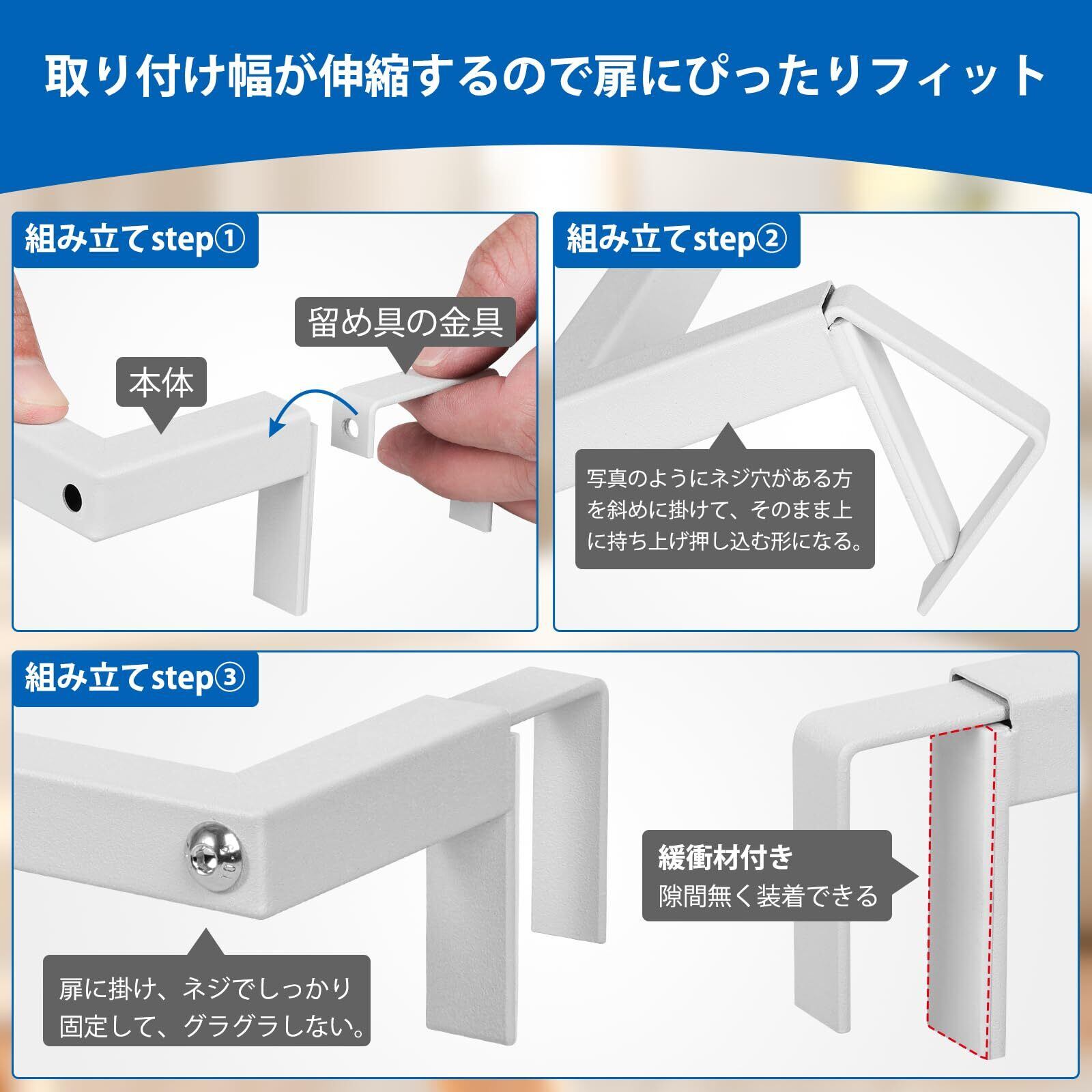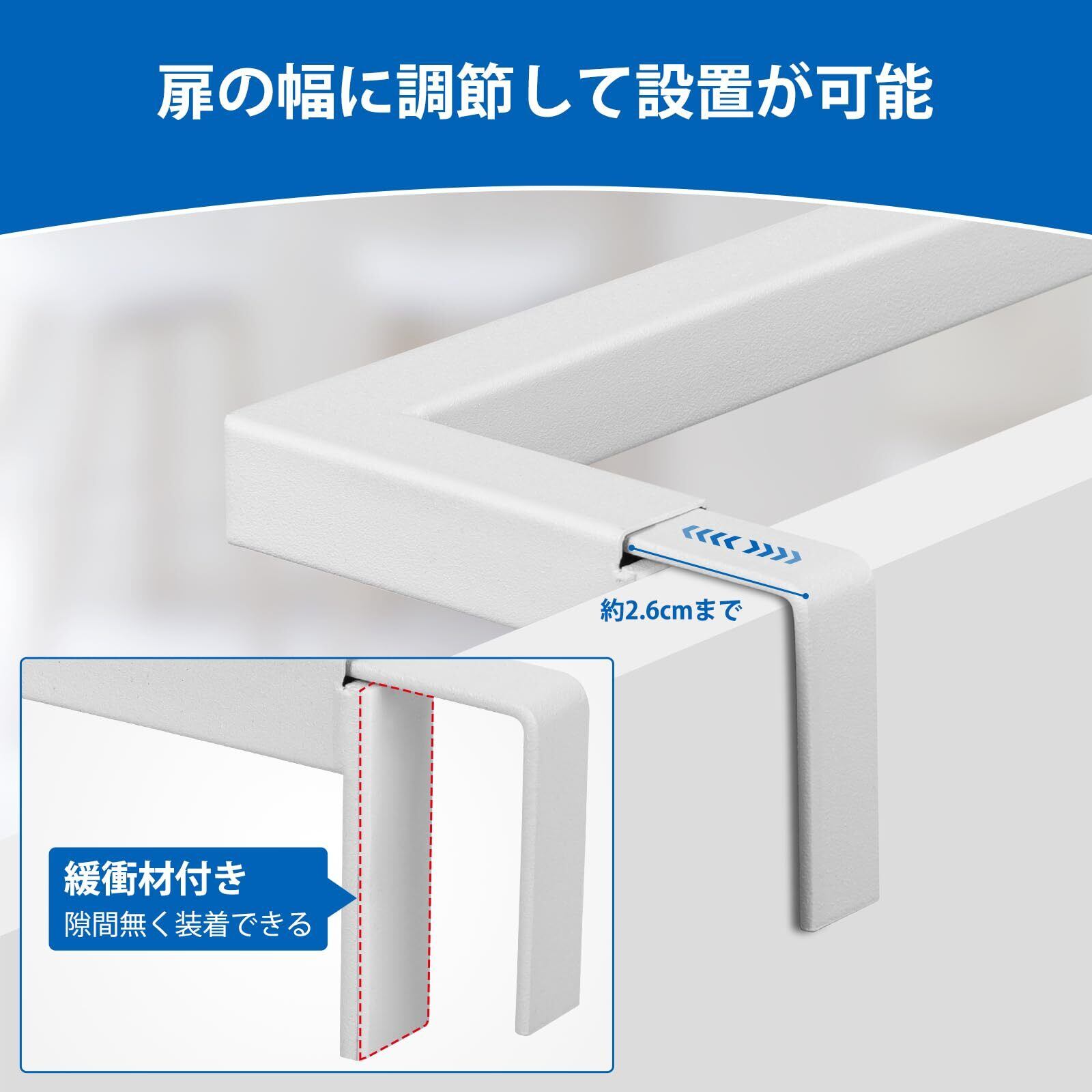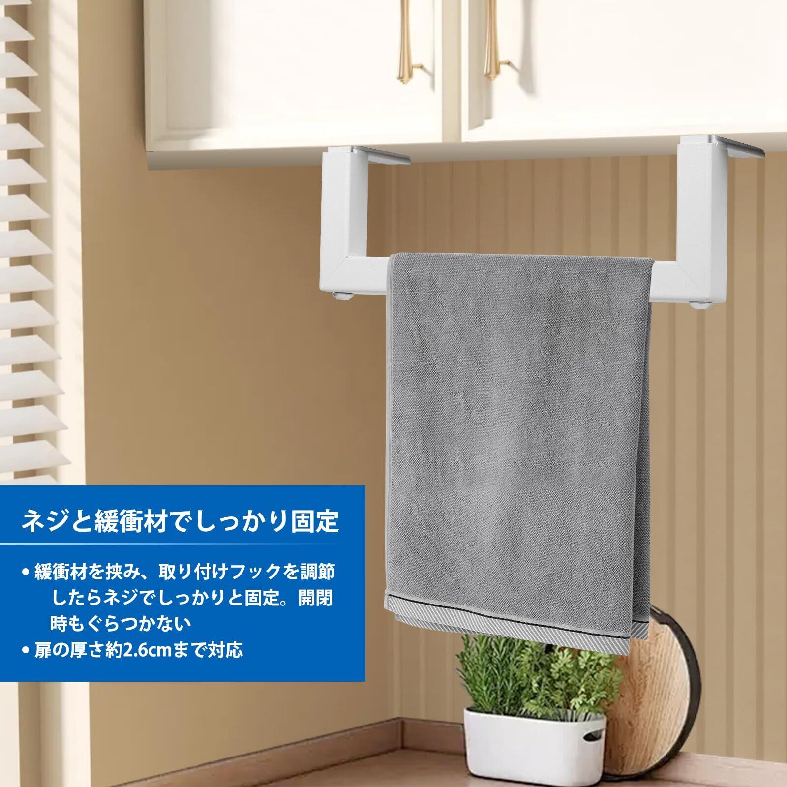 取り付け幅が伸縮するので扉にぴったりフィット:タオルハンガーの取り付けフックは伸縮できるので、扉の厚さに調節してしっかり固定できます。扉の厚さは約2.6cmまで対応可能です。