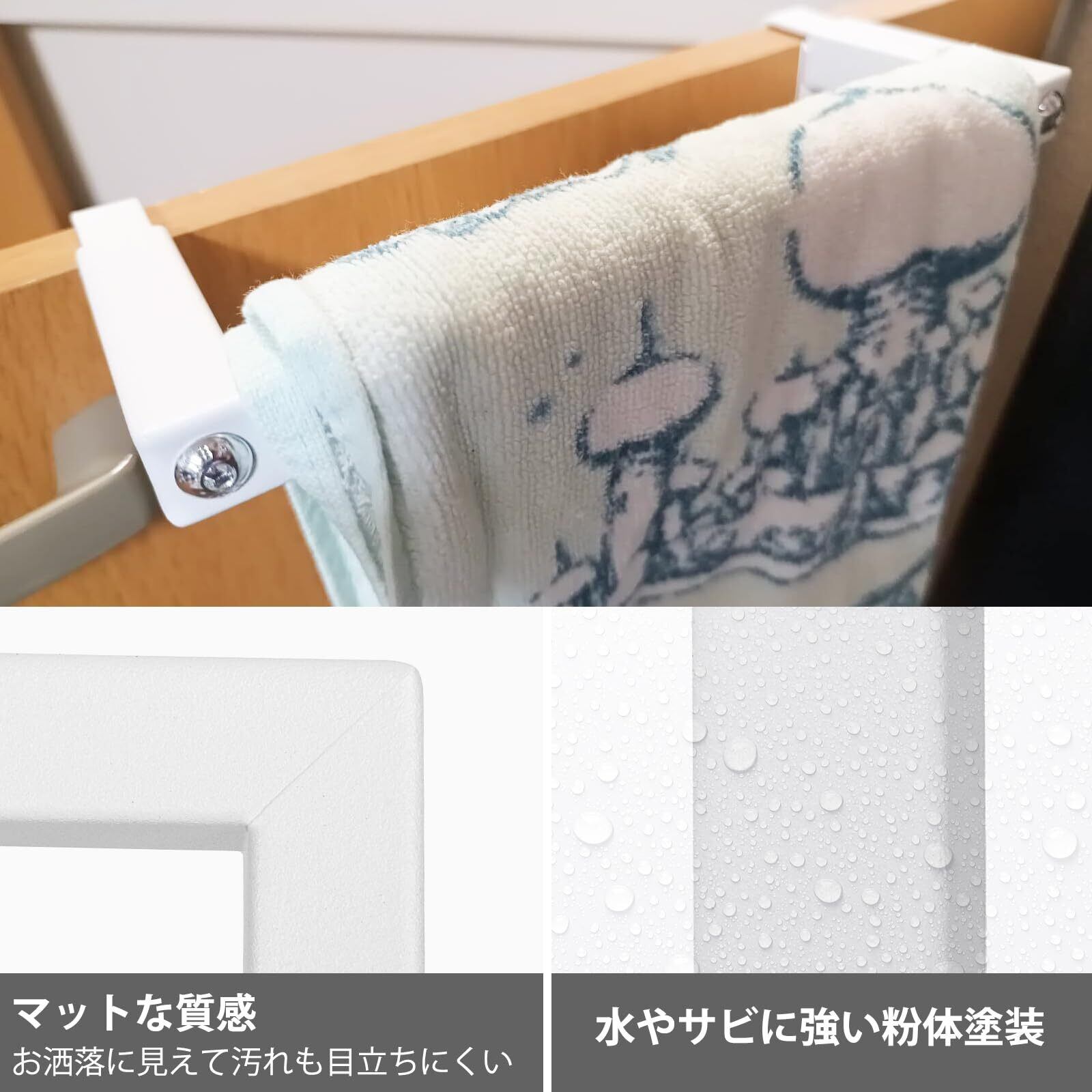シンプルなデザイン:キッチン・洗面所・トイレの扉の幅に調節して設置が可能なタオル掛けです。シンプルなデザインで見た目も違和感ありません。取り付けフックの厚さは2mmだけ、扉の開閉を邪魔しません。