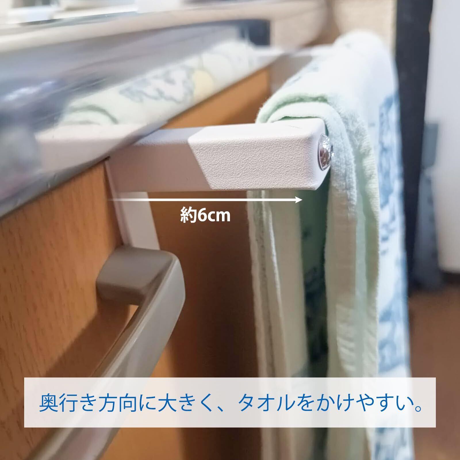 このタオルハンガーは、約W19cmのコンパクトなサイズで、シンク下や洗面所に簡単に設置可能。設置が簡単なので、手軽に毎日の生活に取り入れることができます。お料理や掃除の合間に、タオルをサッと掛けておくことができる便利さを実感していただけます。