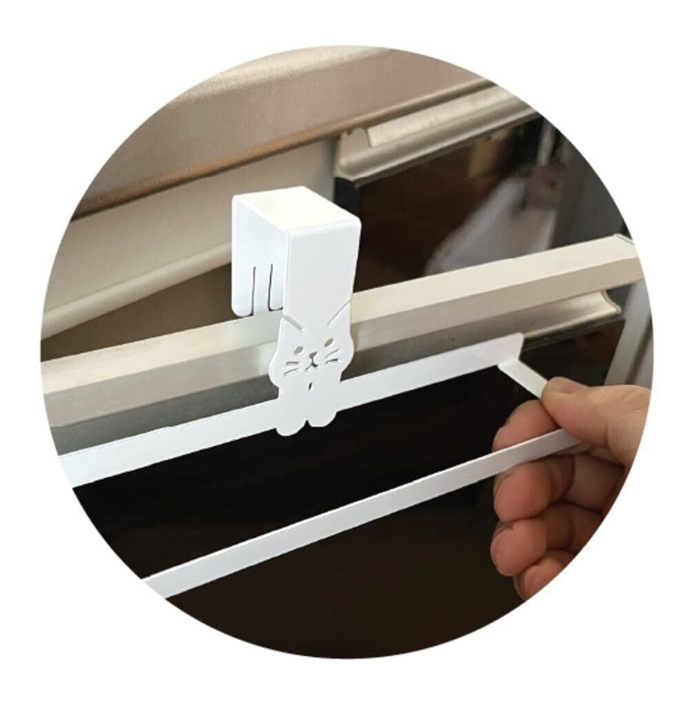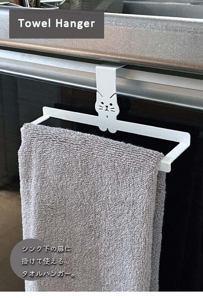 モノトーンカラーの猫型キッチン雑貨。扉に掛けて簡単に取り付けられるフックタイプのタオルハンガーです。扉の厚み約28mmまで対応しています。シンク下の扉に付けて、洗い物の後にすぐに手を拭けるようにしたり、洗面所の洗面台下の収納扉に付けて、タオルを2つ使い分けるなど、手軽にお使いいただけます。