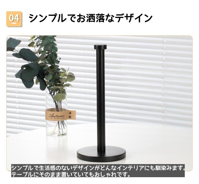 【置くだけで設置完了】ちょうど良いサイズなのでキッチンの空きスペースに置くことができます。ペーパーは上からストンっと入れるだけで楽々。調理中に手の届きやすい所に食事の時は食卓でのご利用も可能です。ストレートなポール形状が出し入れしやすく、ロール紙のホールド性も良好です。