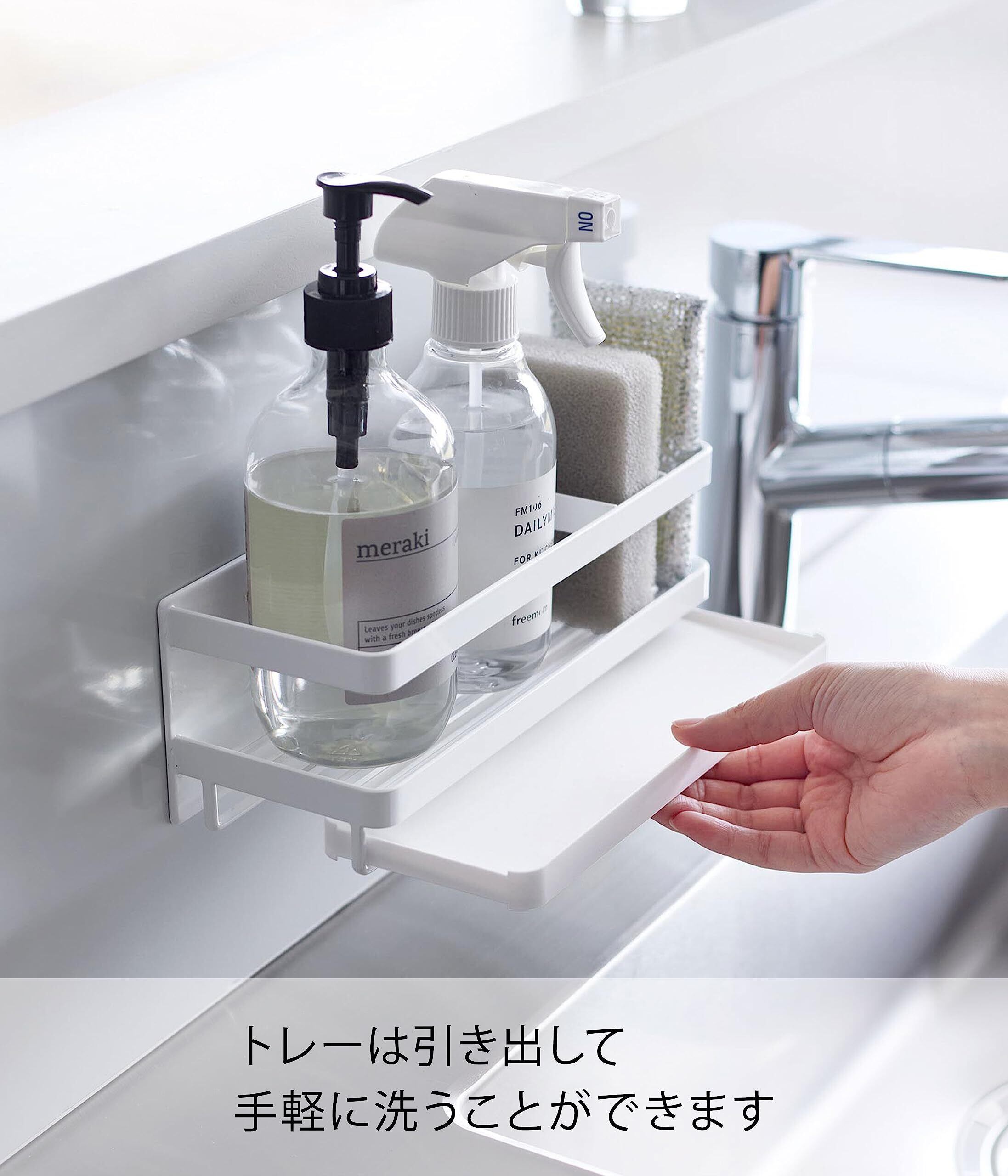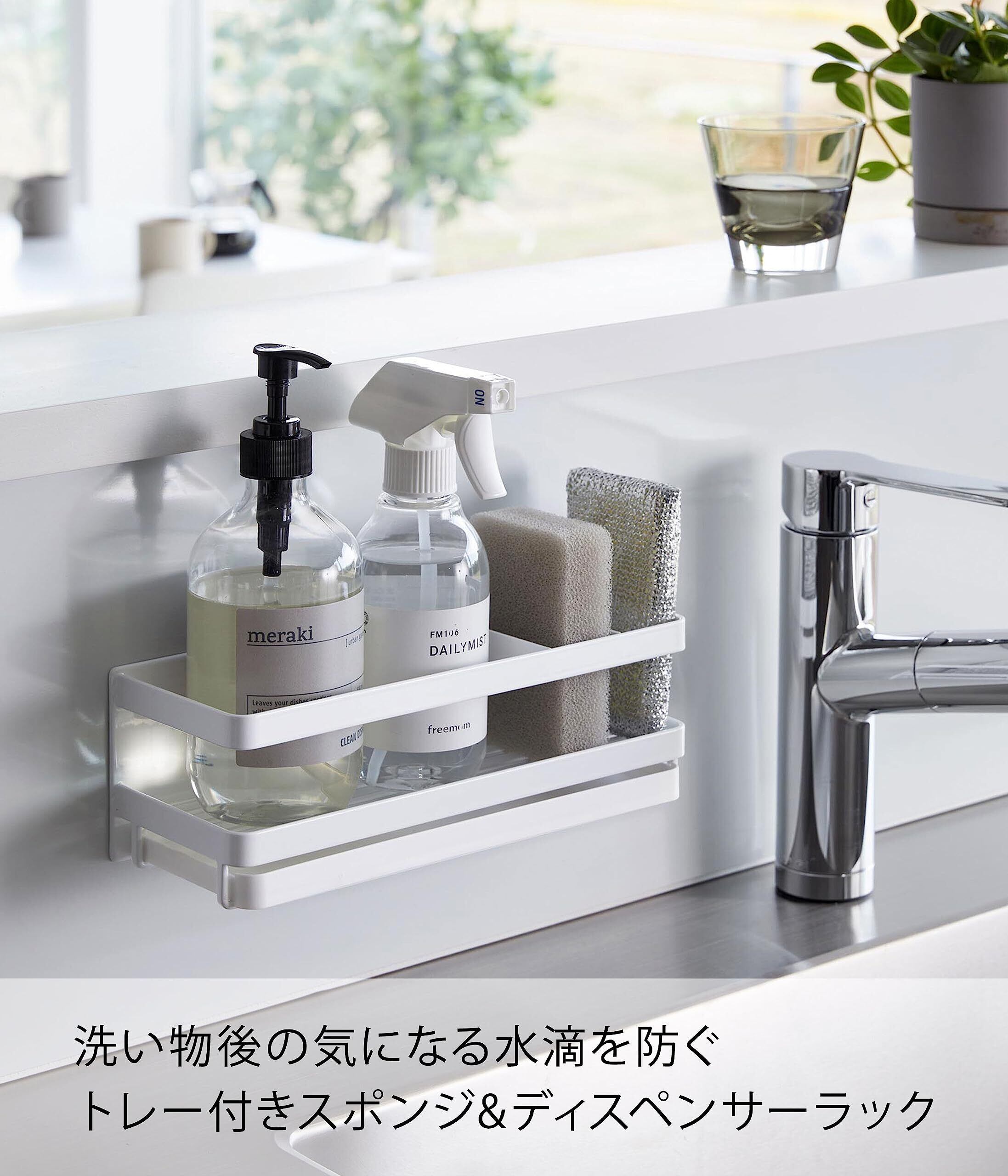 「この『山崎実業 マグネット スポンジ & ディスペンサーラック』で、あなたのキッチンをさらにスッキリ整頓してみませんか!」/特徴:シンプルなデザインのトレー付きラックは、マグネットで取り付けられ、スポンジやディスペンサーをすっきり収納できます。浮かせることで、スペースを有効活用し、清潔感を保つことができます。