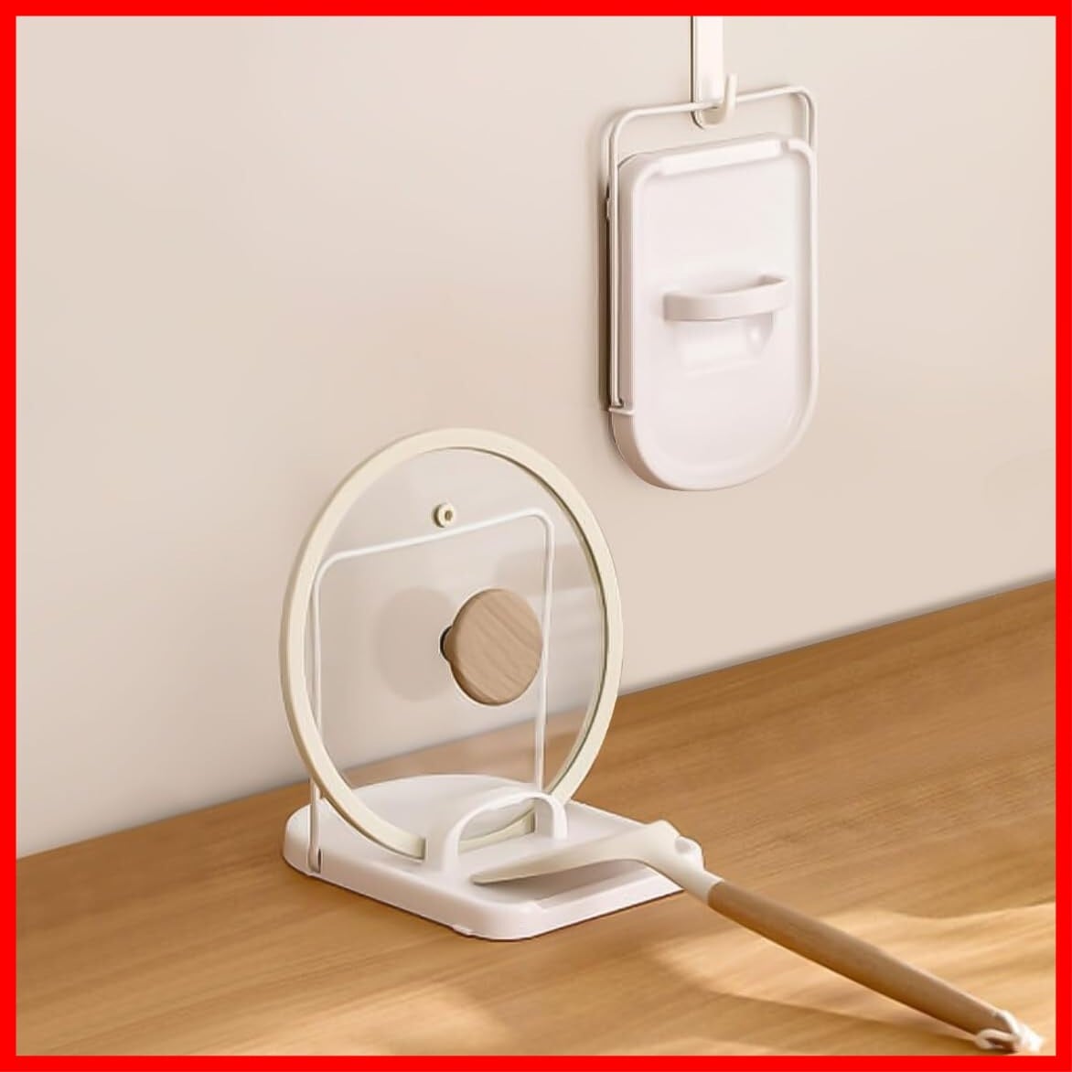 「この『DoocliB 鍋蓋スタンド』で、あなたのキッチンをもっと効率的に整理整頓してみませんか!」/特徴:エレガントなホワイトのデザインは、あらゆるキッチンに美しく調和しながら、大切な調理器具をすっきり収納できます。このスタンドは、鍋蓋やお玉、しゃもじを立てるために最適で、調理中も手軽に使える便利さが魅力です。