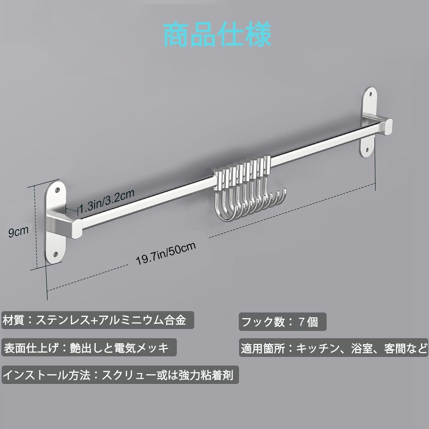 材質:ステンレス、サイズ:50cm/59.5cm/40.5cm、フック数:7個/8個/6個